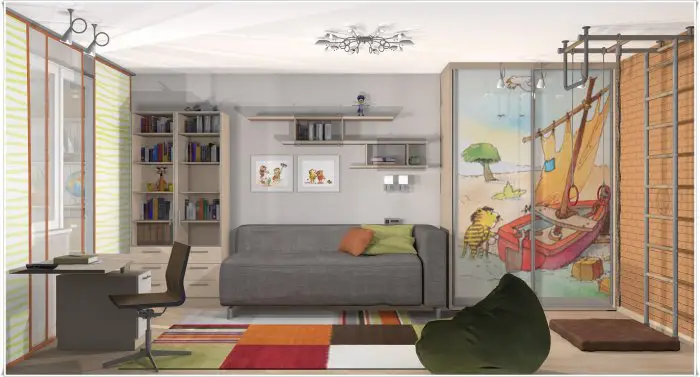 儿童房。在具有这种布局的公寓中,儿童房空间宽敞,足以布置完整的睡眠、工作和游戏区域。