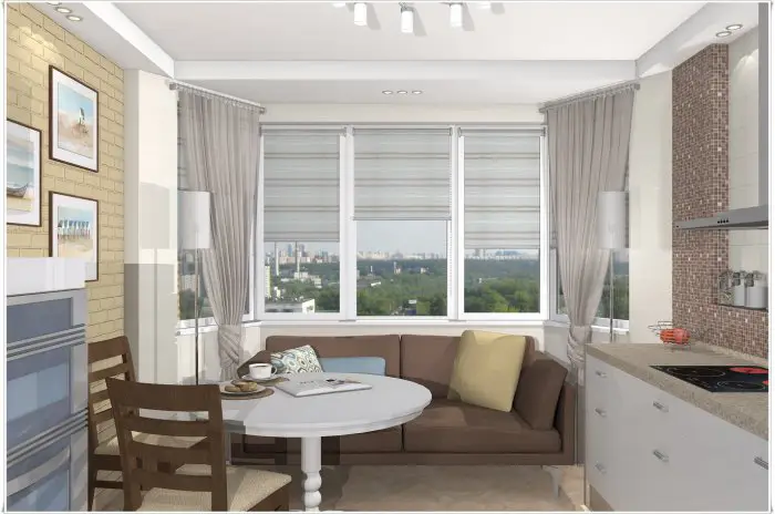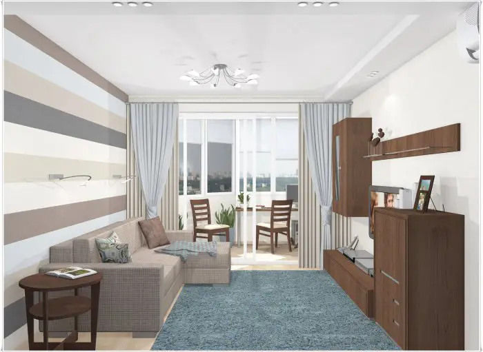 客厅。您可能无法负担单独卧室,但客厅中的睡眠区域也许非常实用:如果不用来自己,那可能用作客人休息。阳台上的工作区放置在客厅旁边很方便,但首先应确保阳台保温。