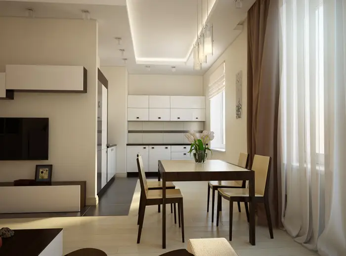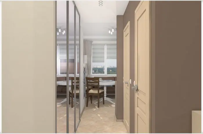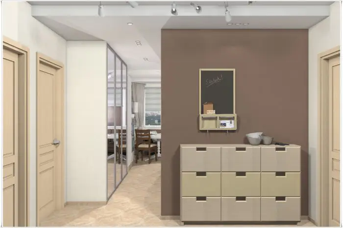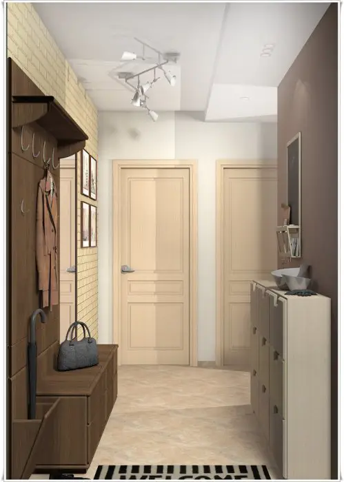 门厅。此两居室公寓的内部设计没有采用激进方案:一切都非常简洁且再次符合标准。门厅设有挂衣架、鞋柜和小件家居用品储物柜。理想情况下,可以安全地用壁挂式挂钩替代笨重的挂衣架,并将不实用的储物柜换成柔软美观的脚凳。
