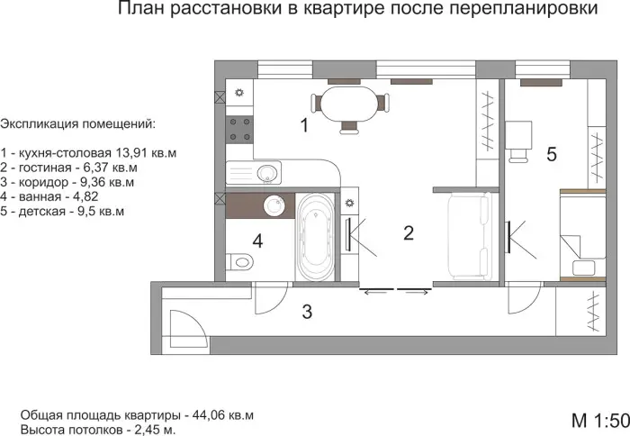 公寓:两室,五层赫鲁晓夫住宅楼(系列 1-335)的三楼。客户愿望:有必要通过结合厨房和客厅来扩大空间,增加浴室面积,并为儿童单独设一间房。