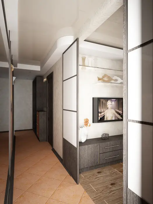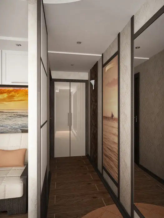 图 2 — 重新规划后,一条狭窄而长的走廊通向儿童房门。通过使用浅色和镜面材料,视觉上扩大了空间