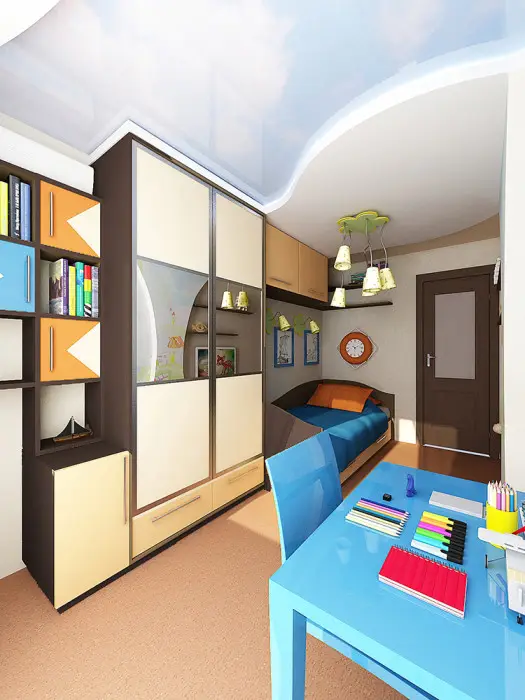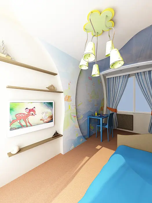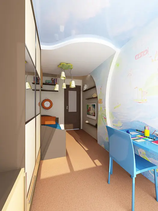 图 8 — 在儿童房中,公共房间的航海风格表达得更加明显。否则,它是一个标准的学生房间设计,适用于六至七年级