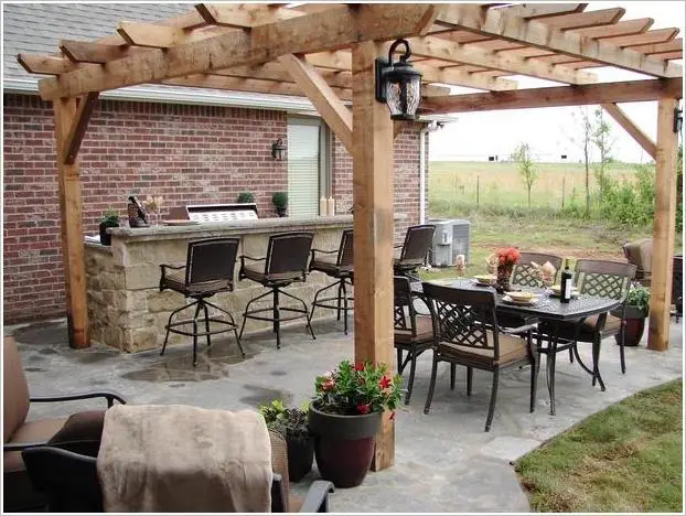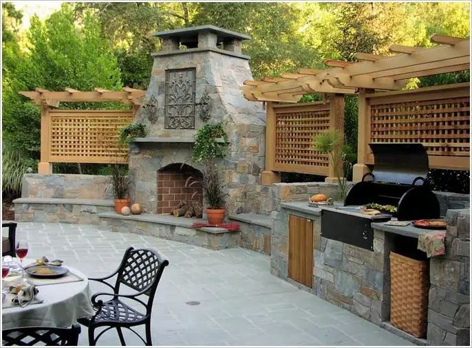 3. 天空下的石制厨房与木格栅围栏