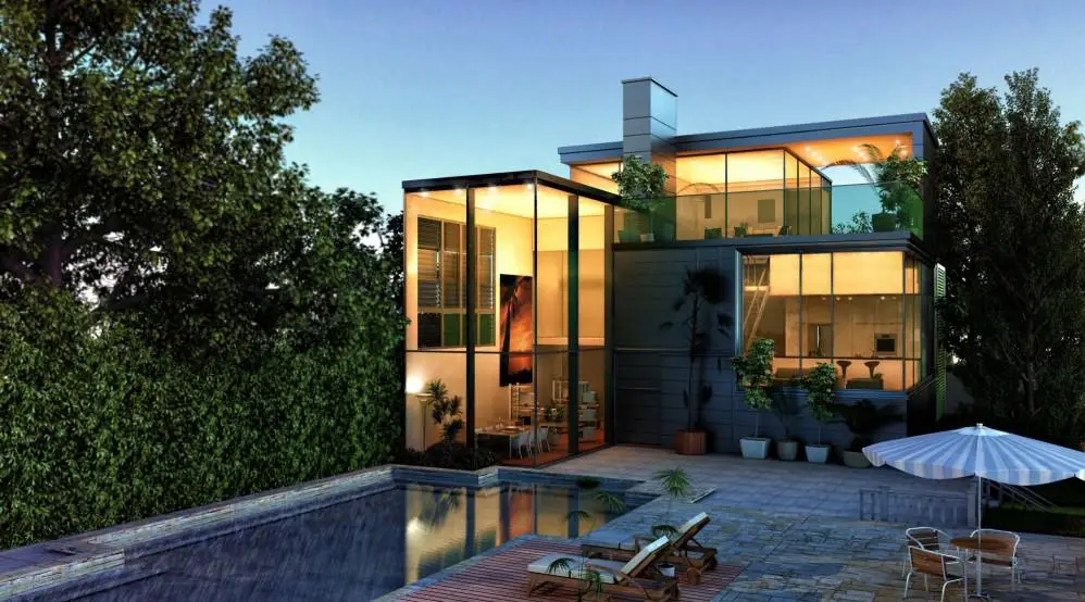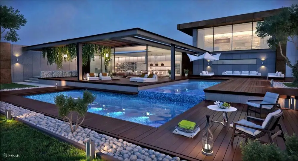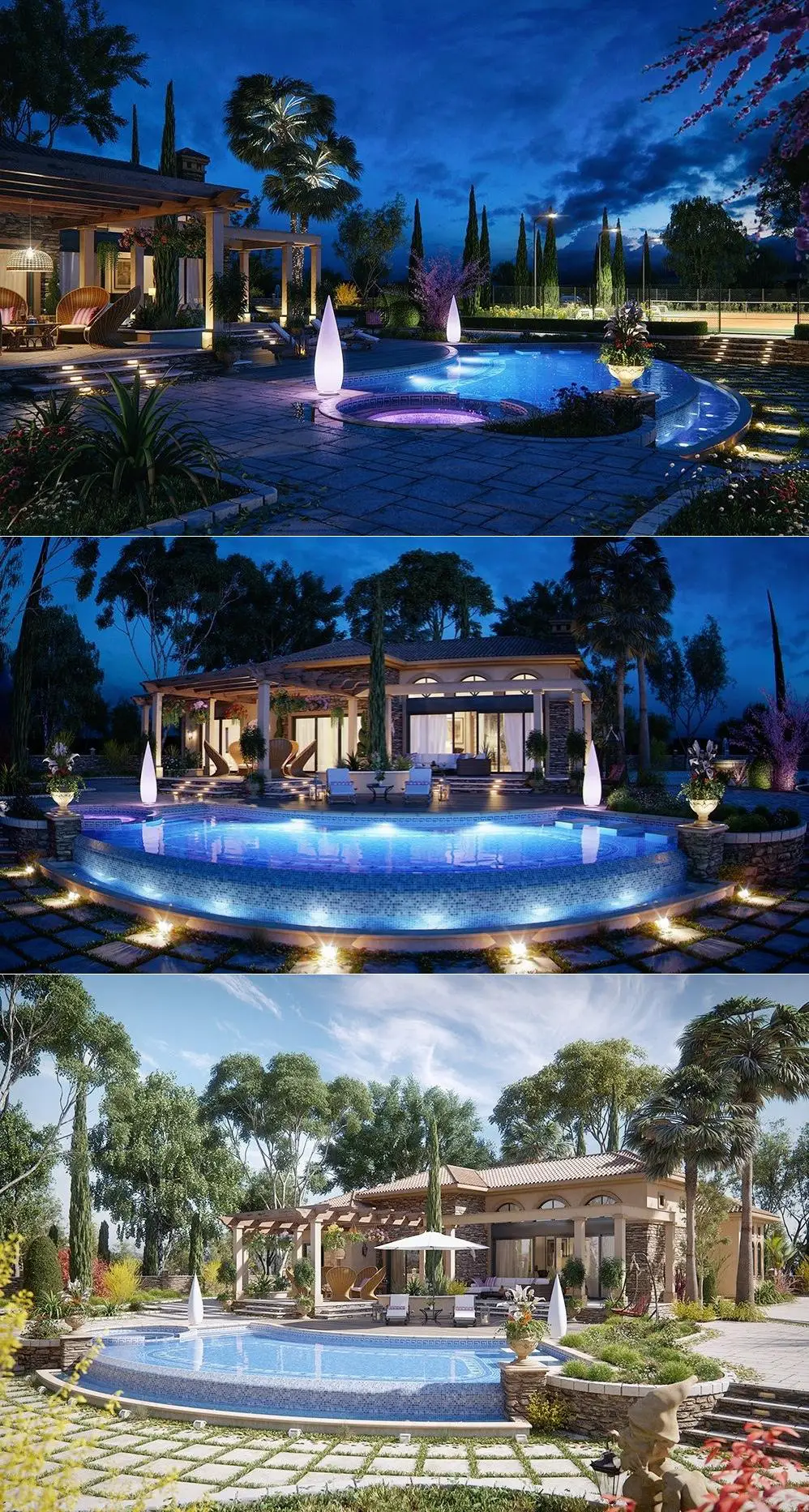 1. 第一栋房屋的独特之处在于其圆形泳池,无论白天还是夜晚都显得充满活力和吸引力。