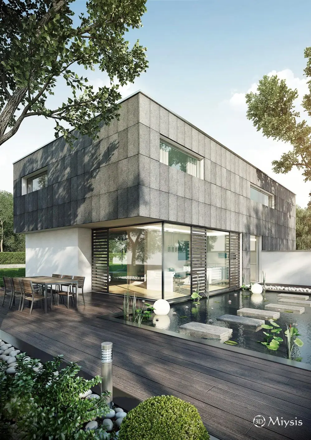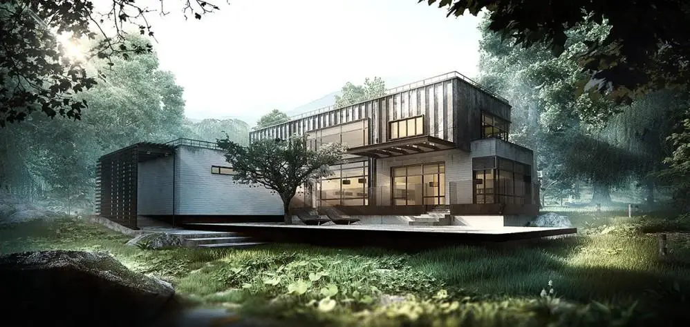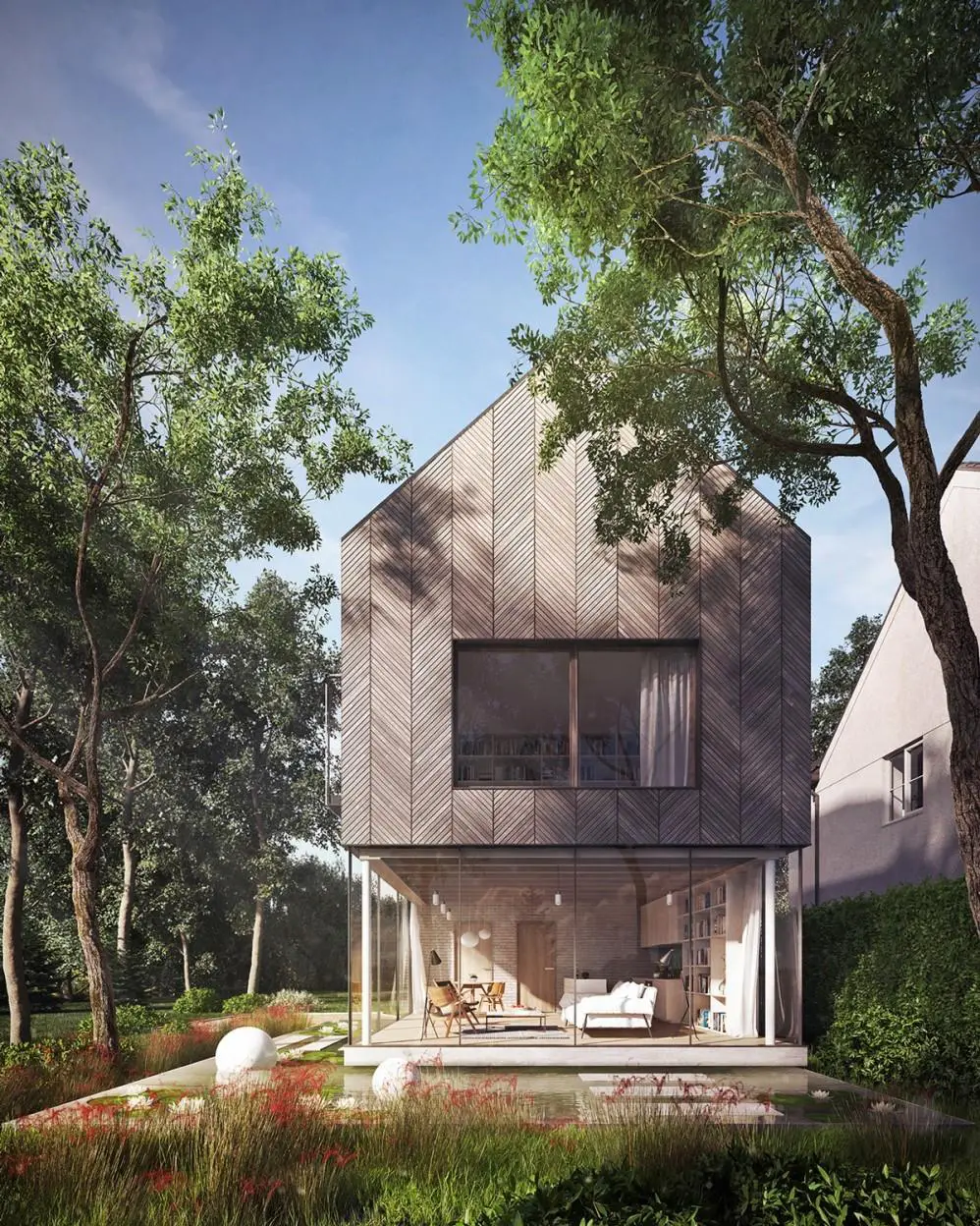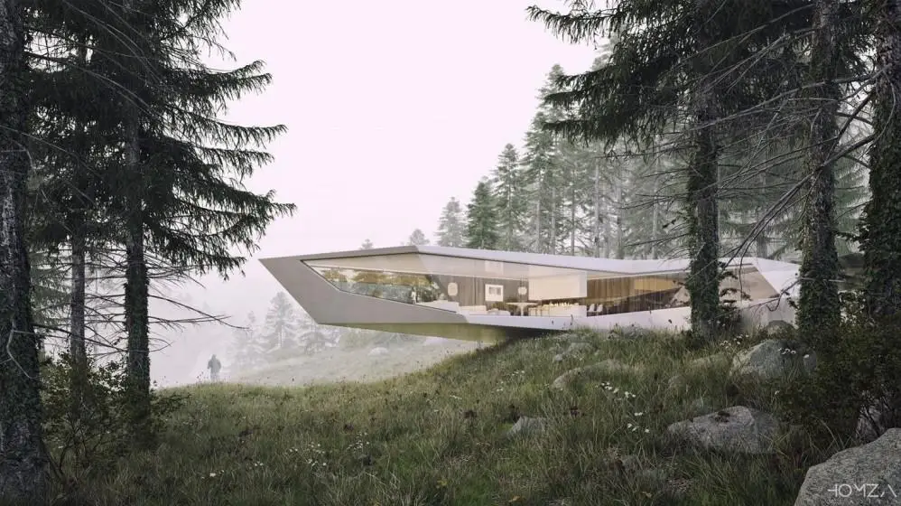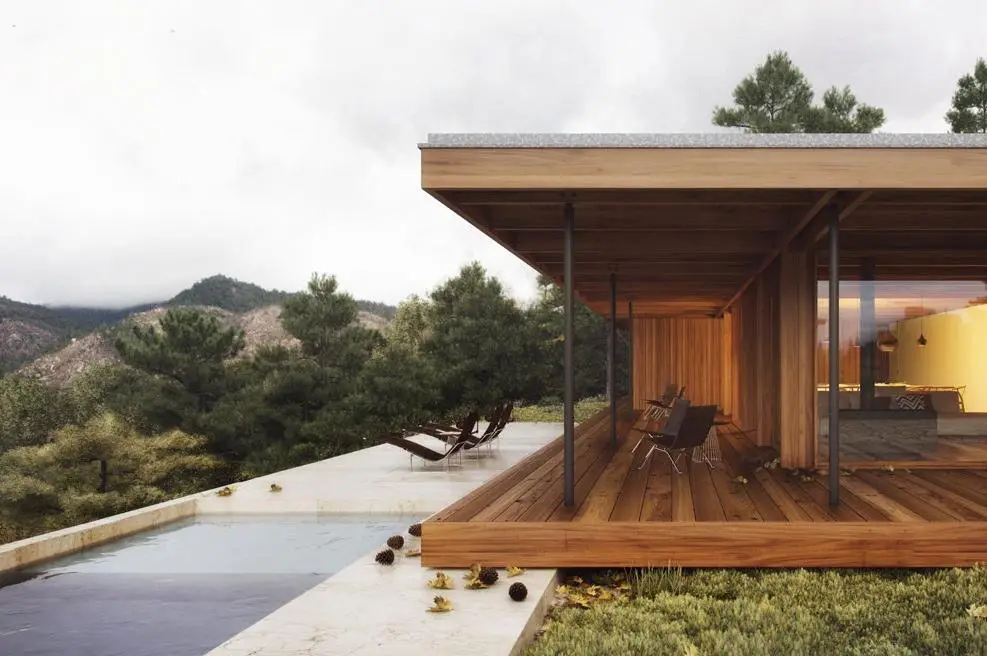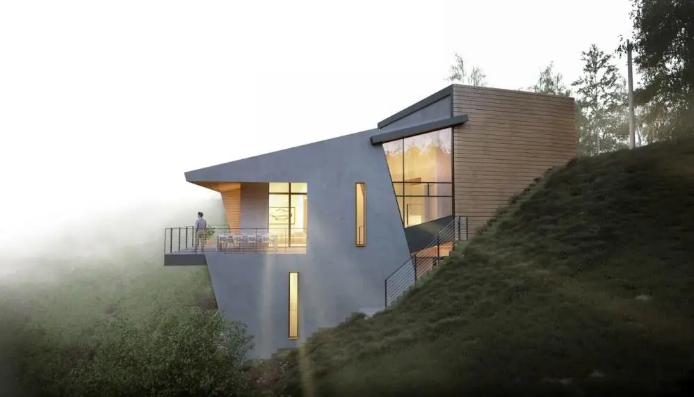 2. 这种柜式房屋的后院笼罩在薄雾之中,营造出一种轻盈和自由的感觉。它与石质和木质框架完美融合。柔和而坚定,坚实而略有不稳定感,呈现出一种有趣的组合。