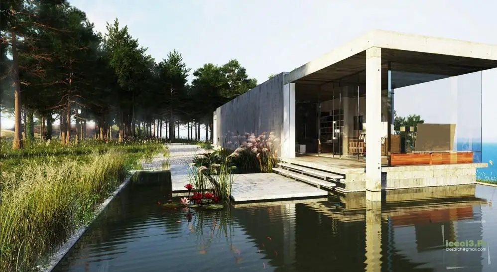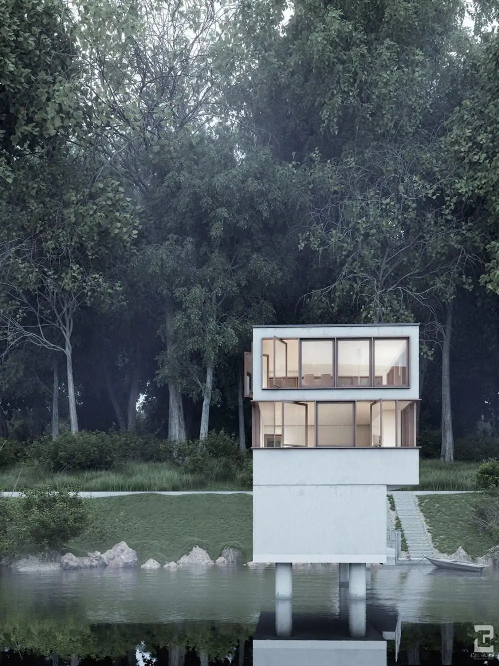 19. 这座混凝土房屋位于湖畔,强调了它在其中自由漂浮的印象。