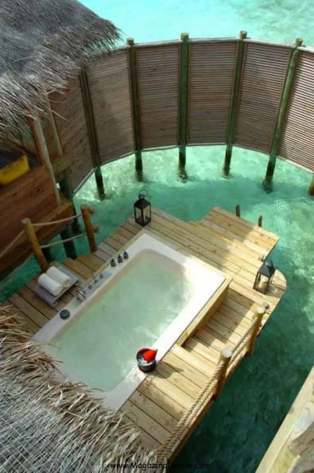 谁不想在这里放松呢?马尔代夫的这个户外浴室看起来就像只为您保留的天堂。你必须承认,户外淋浴或泡澡没有什么比这更好的了!