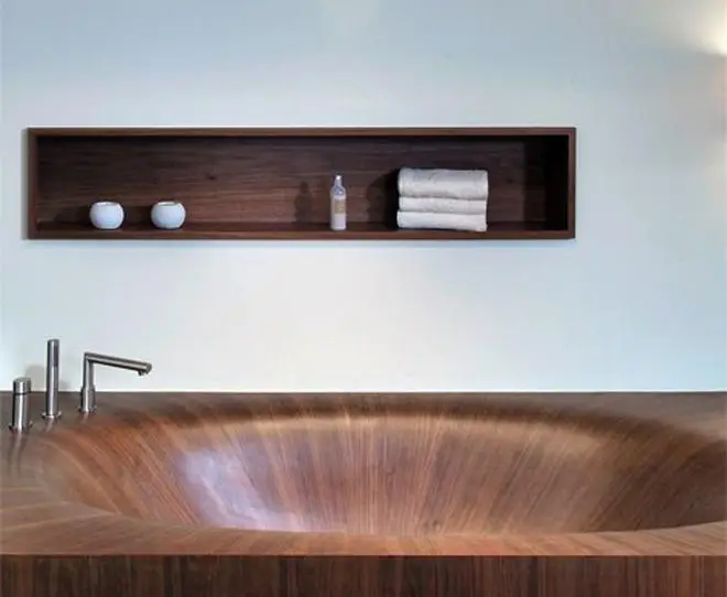 这美妙的木质浴缸看起来如此温暖自然。落叶木材和柔和棕色色调的精良材料将任何浴室变成您的私人绿洲,就像这间一样!