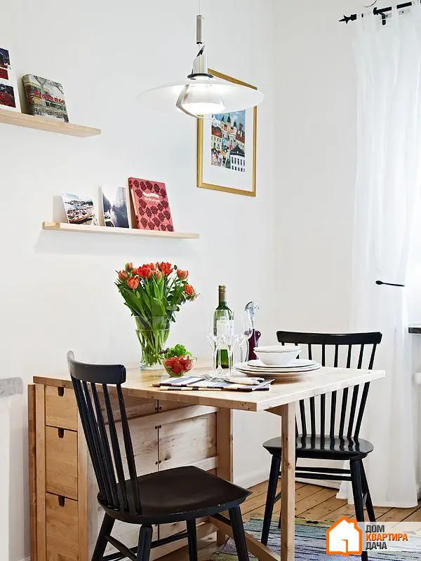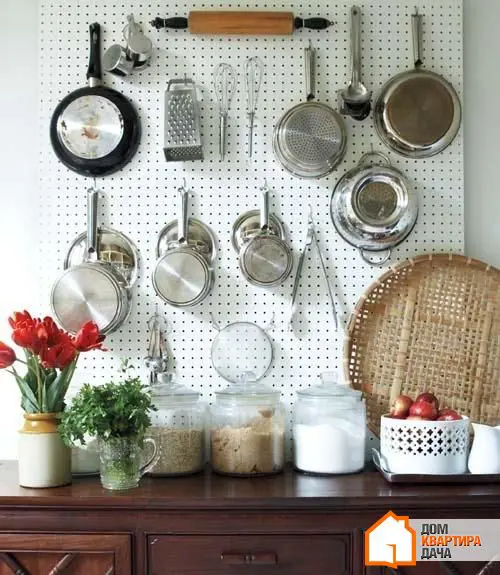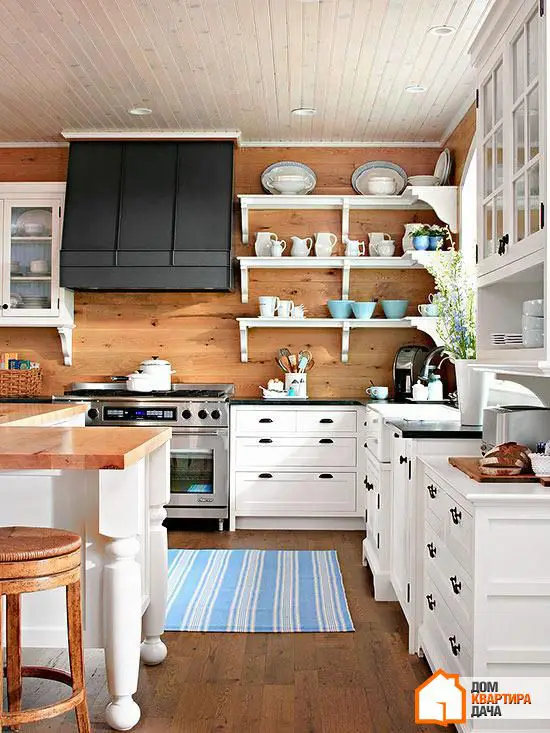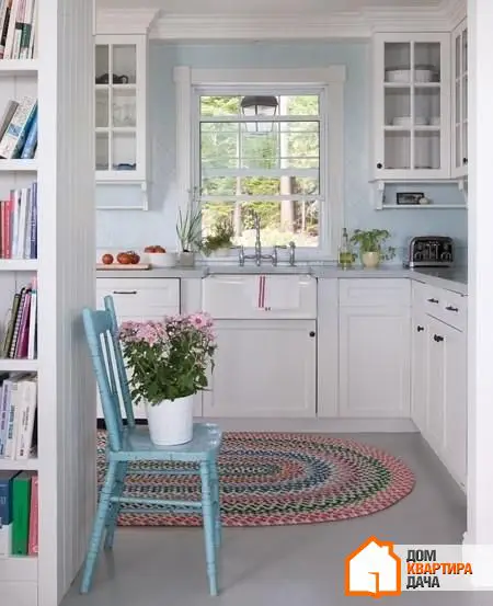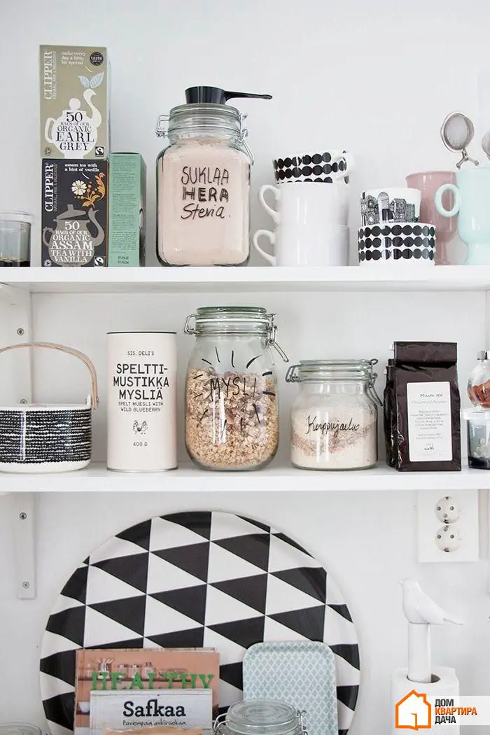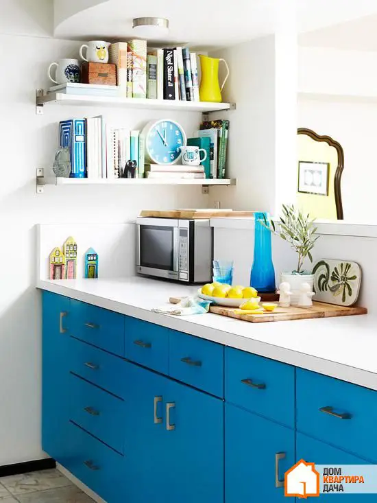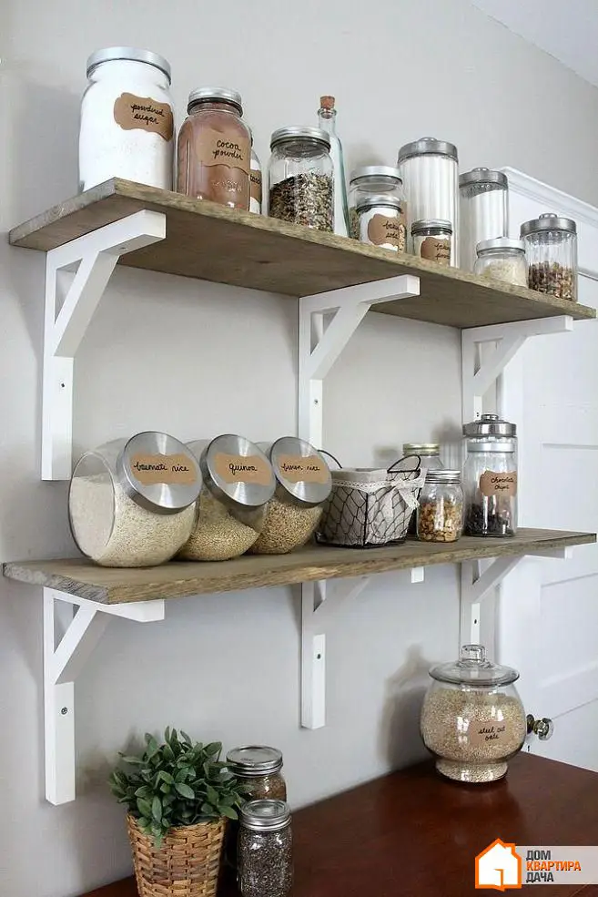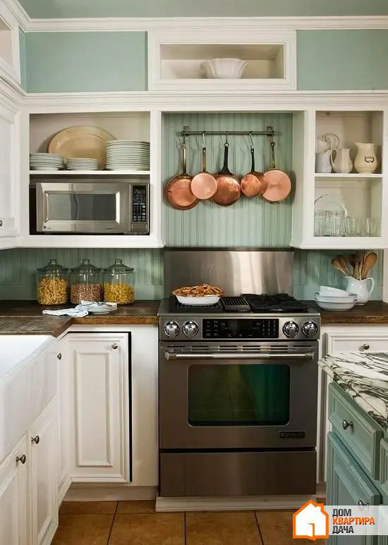 利用空墙安装搁板,这不仅在浴室或客厅中有用,在小厨房中也很实用:它们节省空间并为厨具、食谱和温馨的小物件提供存储。