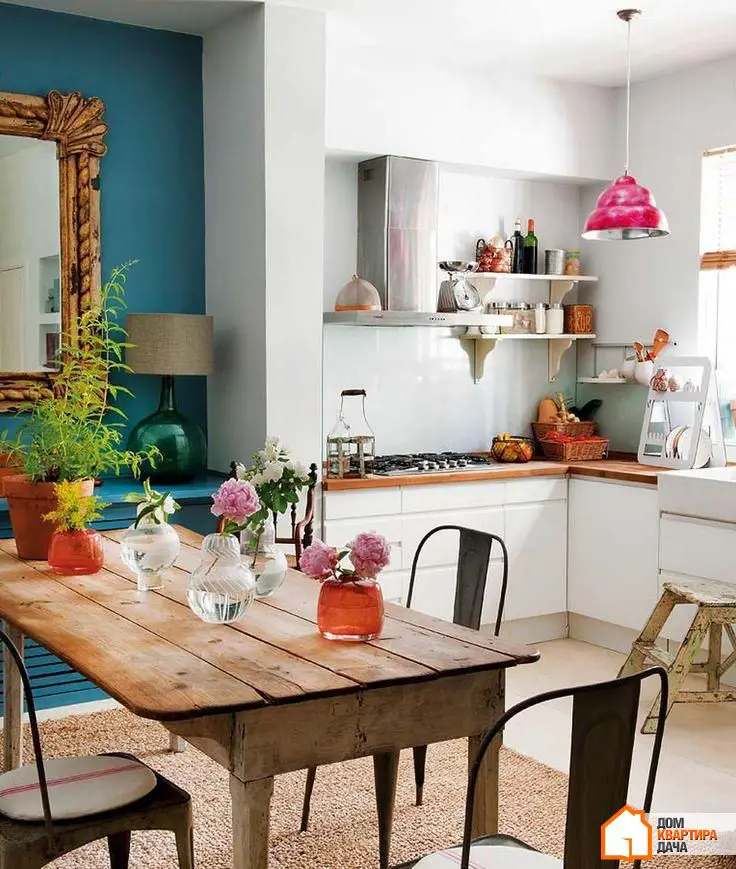 要为厨房内部增添色彩,你不需要一滴油漆。在白色餐具中加入一个或两个鲜艳颜色的物品将看起来非常时尚且吸引人。不仅尝试颜色,还应考虑图案和物品的高度变化。另一个绝妙的点子是用鲜艳布艺靠垫装饰椅子。