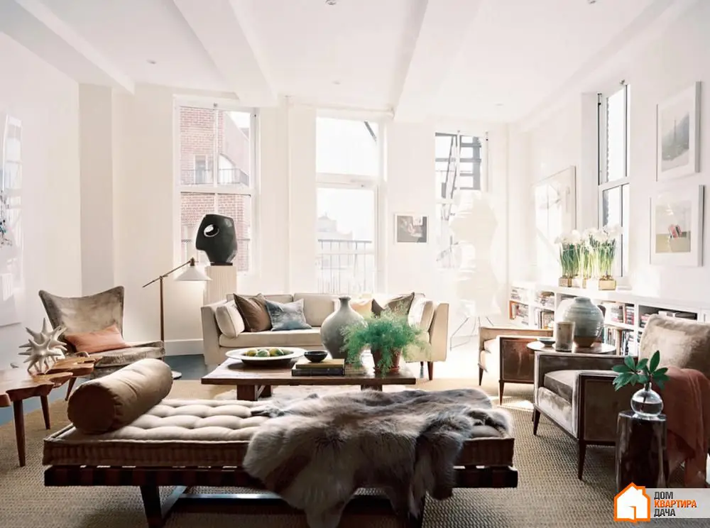 覆盖毛皮的小型室内细节不仅能让你保持温暖,还能作为有趣的风格点缀。尝试将毛皮抱枕与鲜艳色彩装饰搭配:无论是在手工地毯、红砖还是合成椅面上,这种材料都表现出色。毛皮最初是狩猎战利品,这种文化代码也可用于室内设计。当与粗犷的配饰结合时,毛皮装饰能为房间带来波西米亚风格。