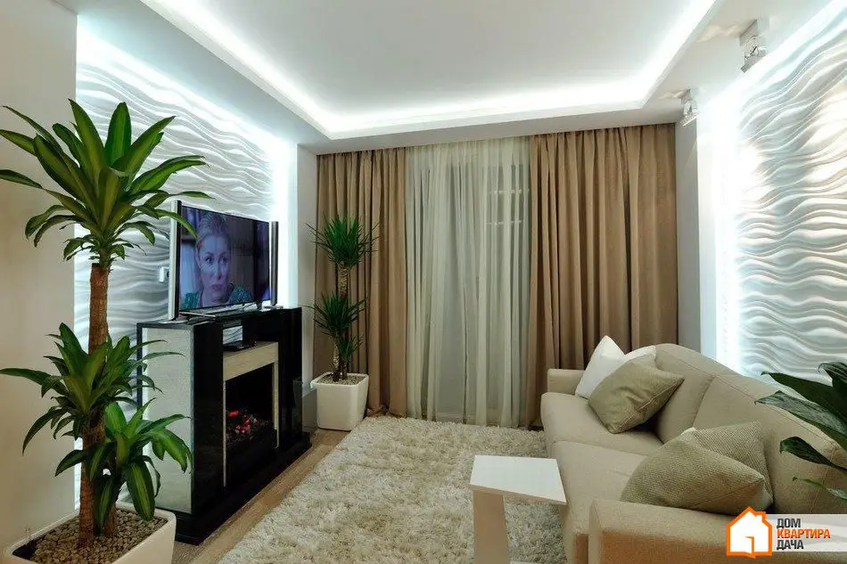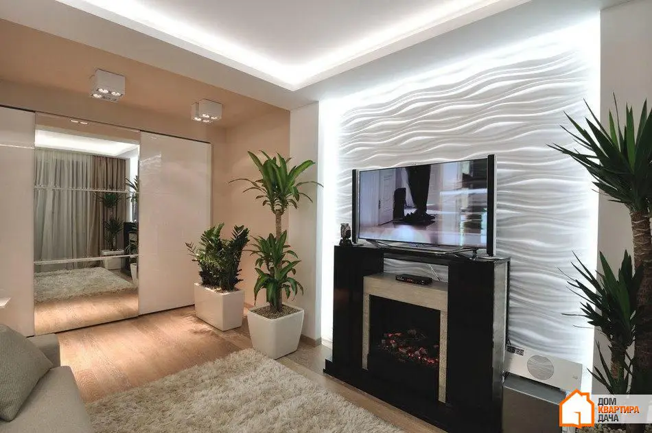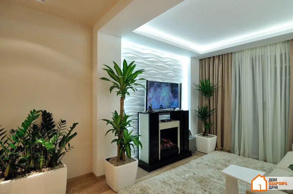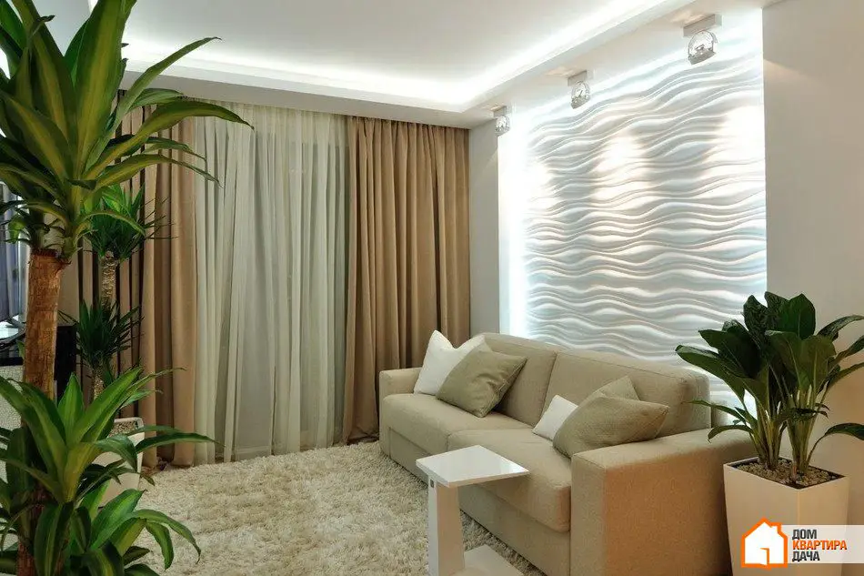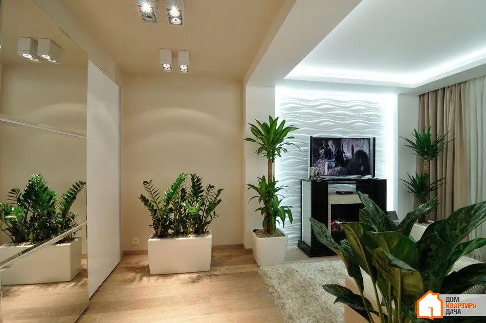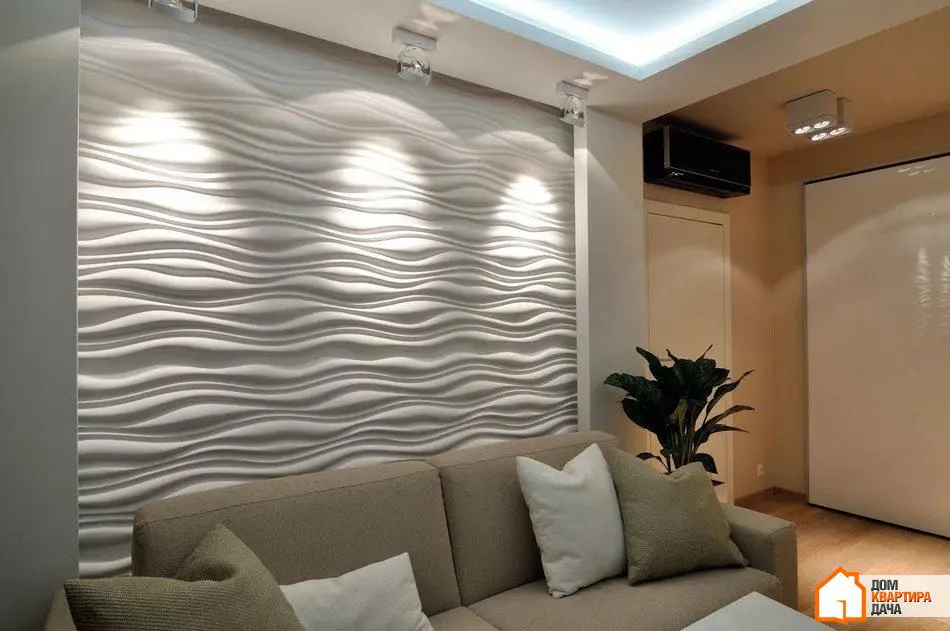 在照明方面,我们成功地创造了一个非传统的解决方案。客厅中没有传统中央吊灯——它的角色由内置天花板背光形成的一个方形来扮演。相同的背光突出了墙面的石膏浮雕面板,作为整体照明使用,因为LED灯条嵌入其中。客厅中还有聚光灯——Delta Light灯具。三盏定向光聚光灯照亮3D面板,而三盏额外的双面聚光灯则照亮储物区。如果只开启聚光灯,照明会变暗。