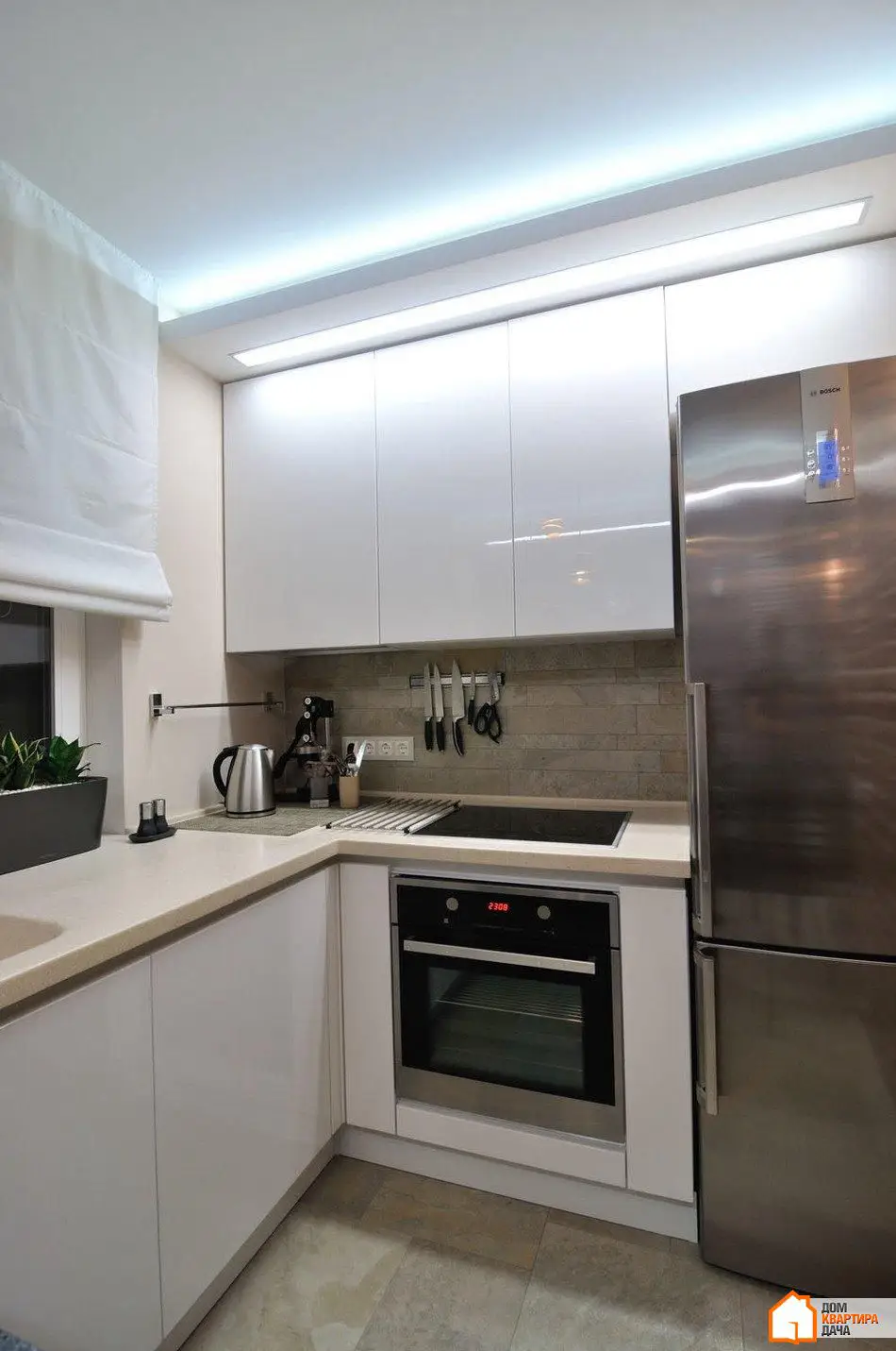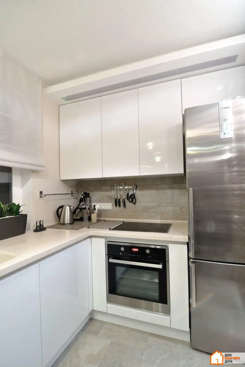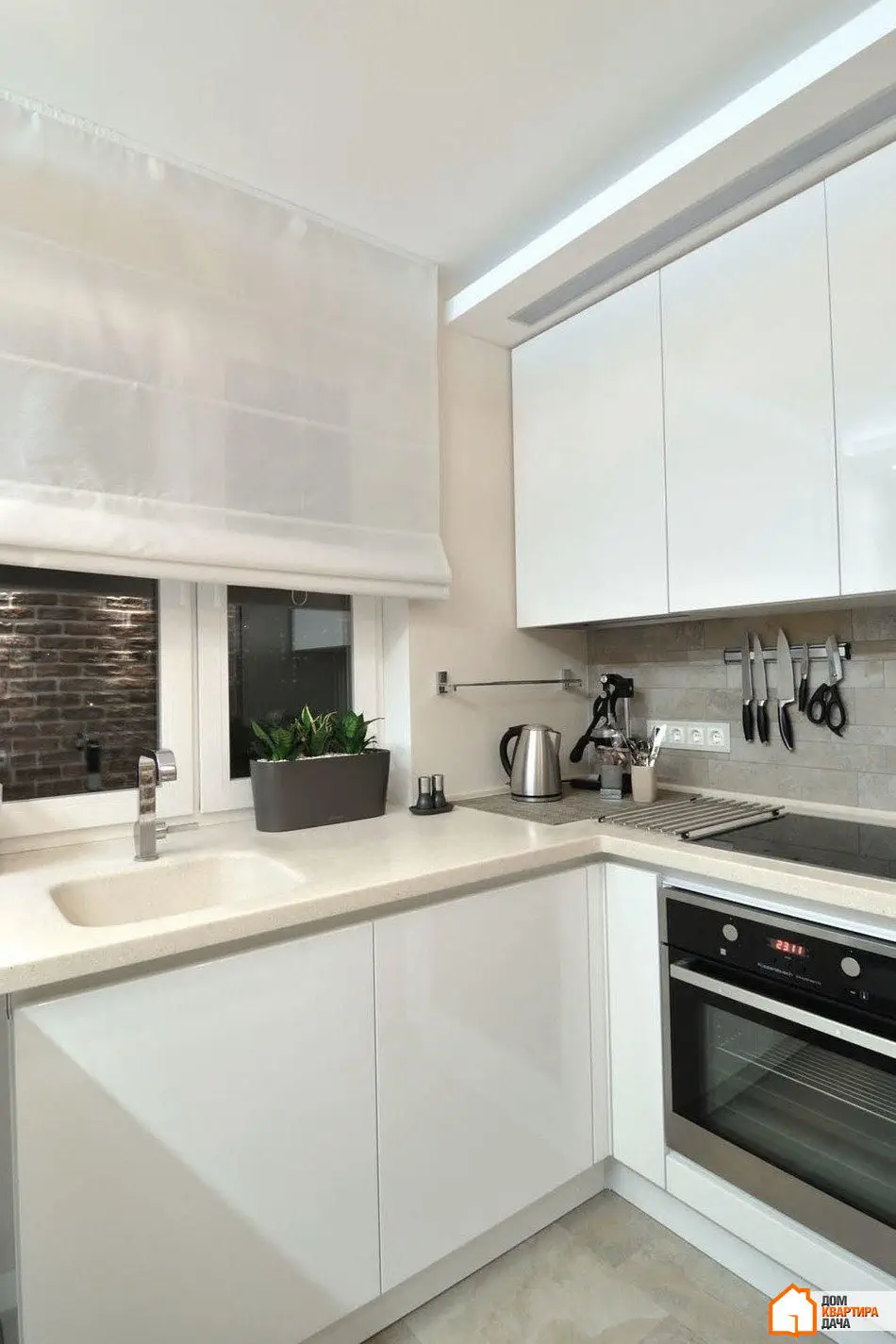 纺织品尽可能简洁。墙壁颜色的直挂窗帘(一侧较深)和简单的香槟色透明纱帘。厨房中还悬挂了白色罗马帘。