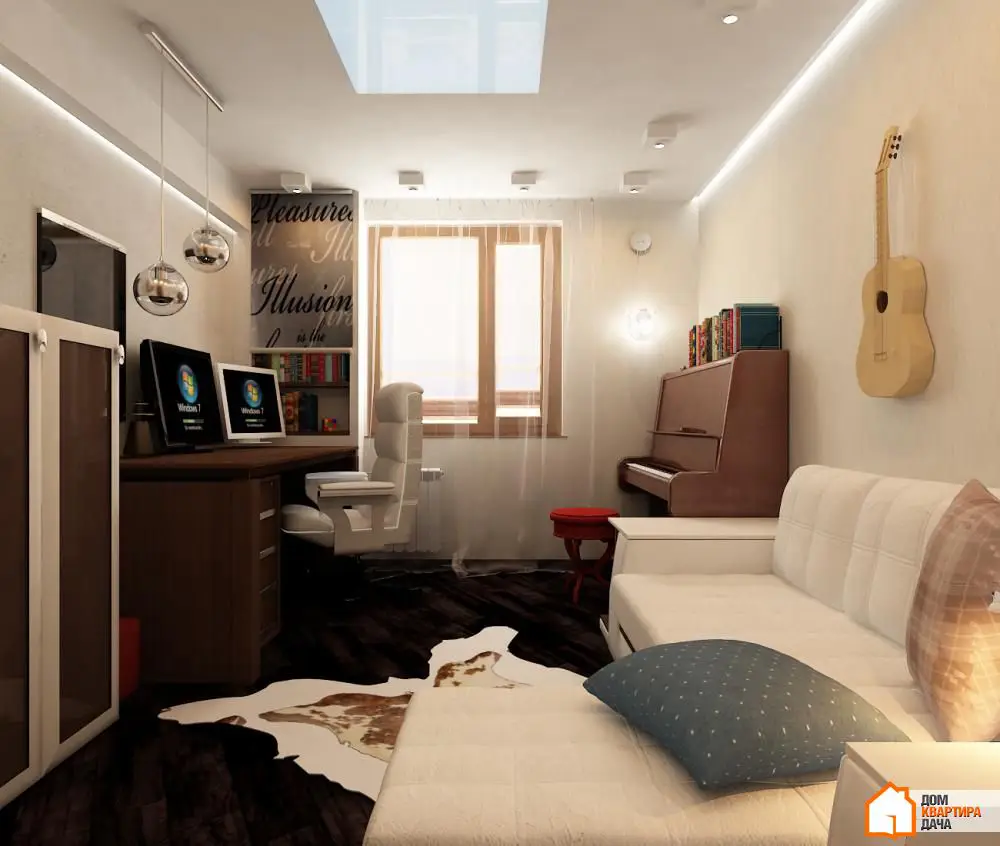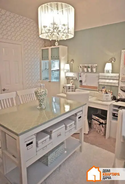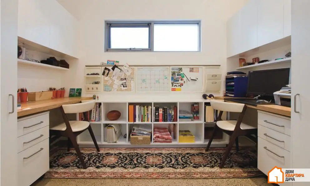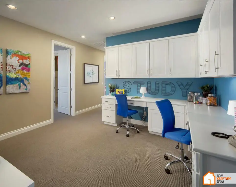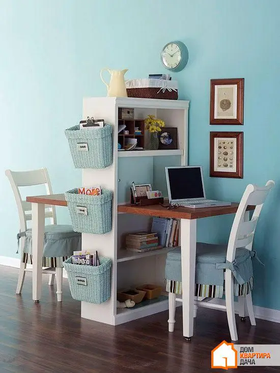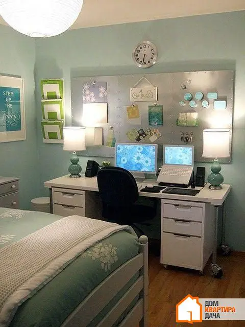 理想的解决方案是两个完整的办公空间或两个儿童房配备学习桌。首先,这可以提供个人空间而不会受到他人的干扰;其次,它提供了舒适的办公条件,没有电话或Skype通话等干扰。设置办公室很简单:用平静、令人愉悦的色调装饰,加入微妙的装饰来营造工作氛围。为了方便获取文件,书架和搁板很有用。