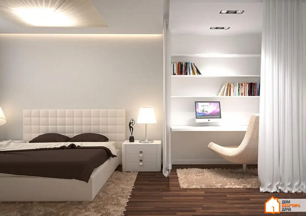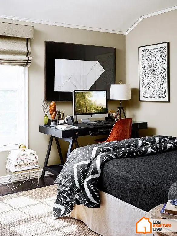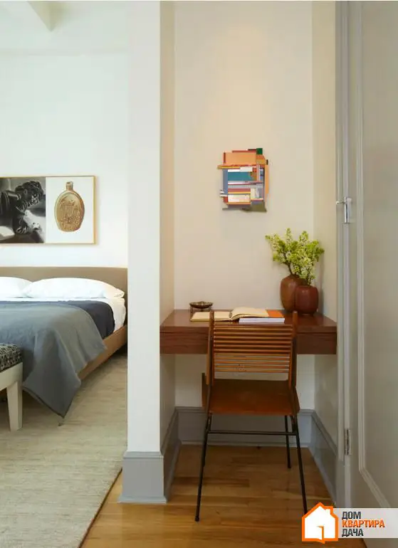 可以在卧室中创建一个紧凑的工作区,而不需要很大的空间。沿着窗户安装一张长条形桌子,或在壁龛中建造一个方形工作区——你的办公角落就准备好了。
