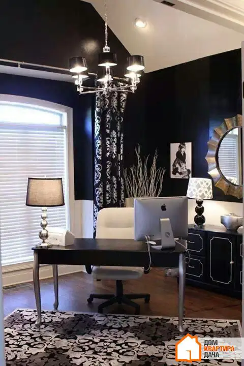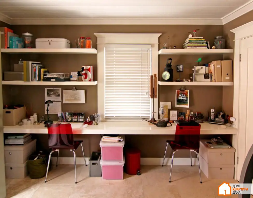 不幸的是,在城市公寓中很难为两个办公室找到空间。在这种情况下,可以尝试合作工作:将桌子并排放置或在墙上设置一个长桌上的两个工作站。确保自然光均匀分布在两个工作区。