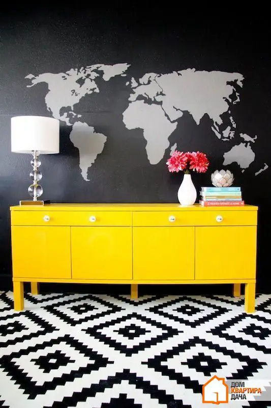 在明亮表面上使用深色调配饰(比如黄色沙发上放黑色靠垫)是一个极佳且时尚的解决方案,可以中和引人注目的颜色。总的来说,颜色间亮度对比越强烈,强调效果就越显著。深色与浅色的对比可以极大地增强房间比例:深色地板在视觉上不会缩小空间,而是通过加入明亮的装饰元素来扩大空间。