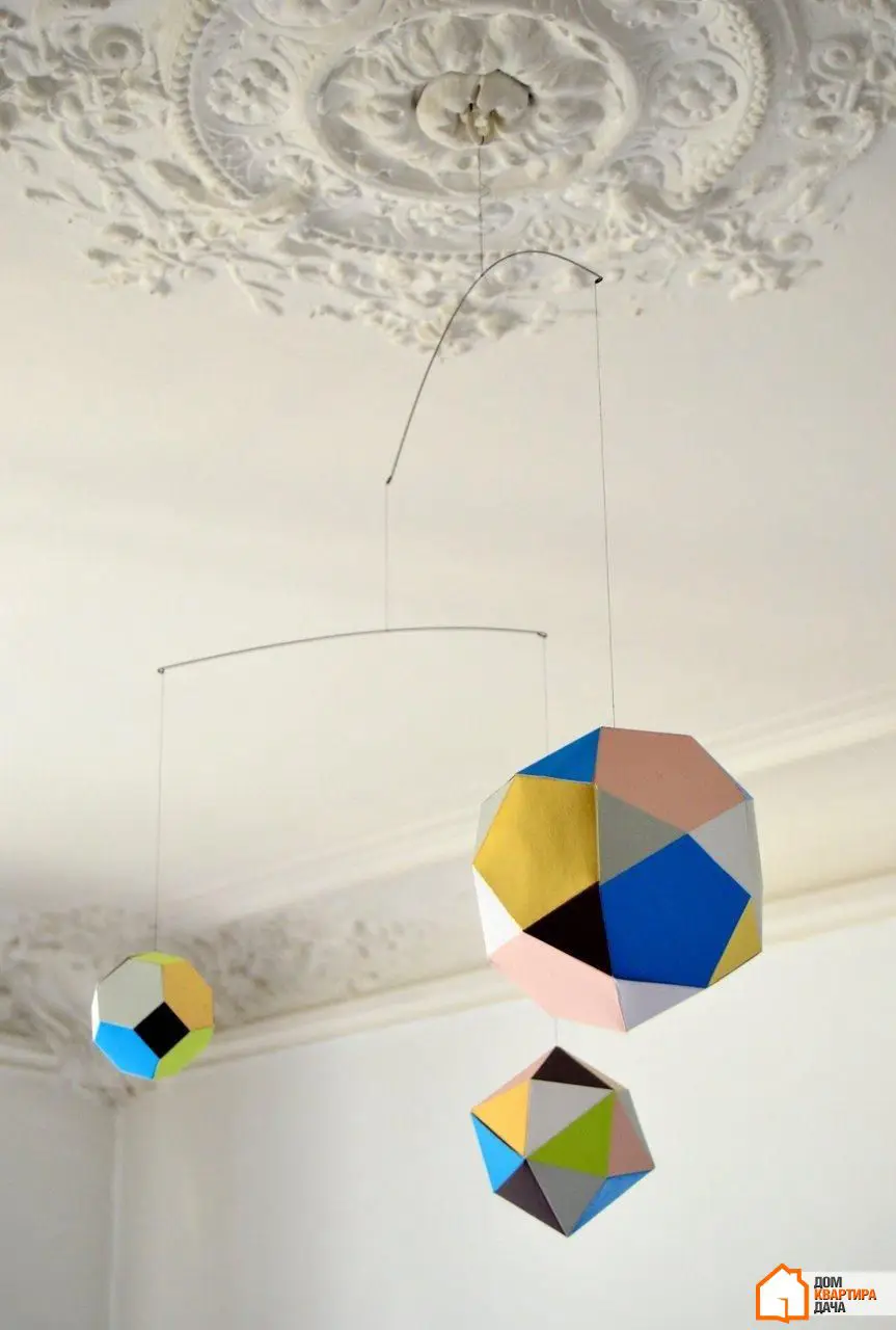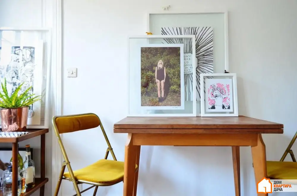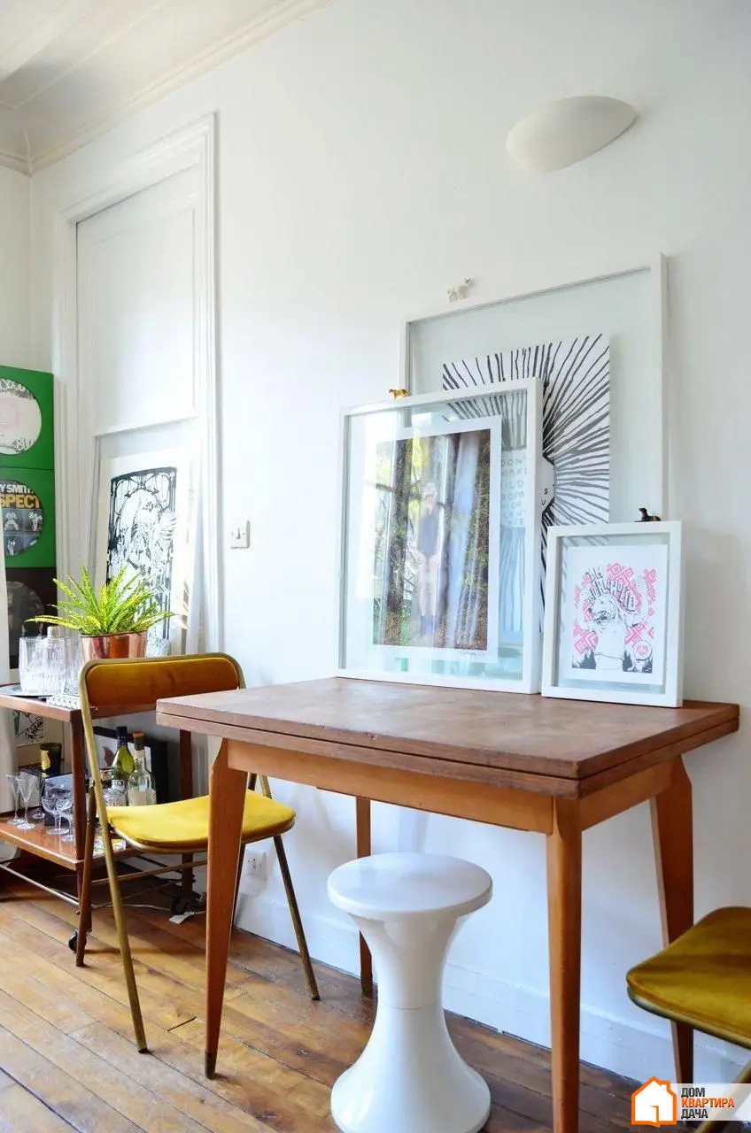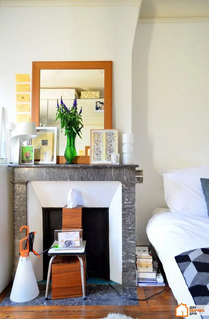 或许卧室的整体风格由一个独特的细节决定——主人将壁炉的大理石门改造成镜面支架。这种创意解决方案在该室内设计中还有很多体现:例如天花板下的立体纸制玩具与装饰线条,或是将普通凳子替代床头柜。然而,尽管这套小而明亮的住宅空间不大,真正珍贵的是主人收藏的各种雕像、印刷品及其他个人装饰品。最终,让居住空间变得真正舒适的方式是将尽可能多反映你生活观的物品和组合融入室内设计之中。