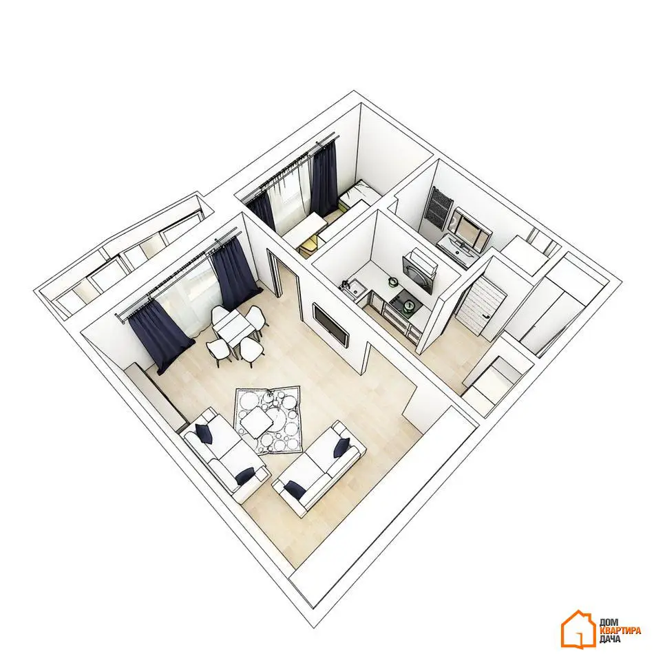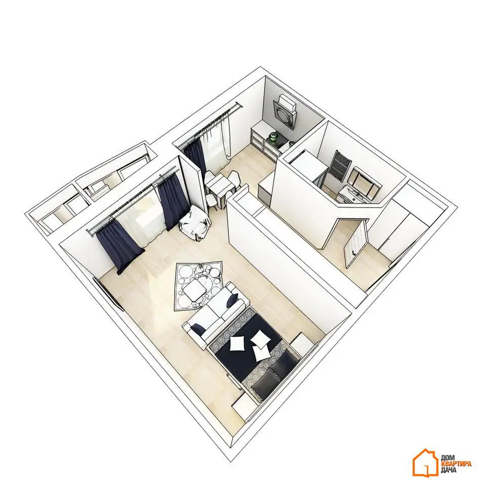 这种布局方案在概念上与前一种非常相似。客户年轻且活跃,因此他们的公寓应具有大量功能。我们将开口移入厨房区域,从而分离出卧室区域。与方案一不同的是,我们建议使用实墙将睡眠区域隐藏起来,使这一区域更加私密。一个宽敞的阳台允许我们将其分为两部分:一部分保持为冷阳台,另一部分则保温并与房间相连,在那里我们设置了一个小型办公区。房间其余部分非常适合休息和接待客人,移动的开口在视觉上将它与厨房连接起来,从而扩大了两个空间。浴室的布局方式与方案一相同。最终我们获得了一个宽敞的走廊和宽阔的过道,允许设置相当宽敞的储物系统。最终我们得到了一个功能清晰分离的空间。