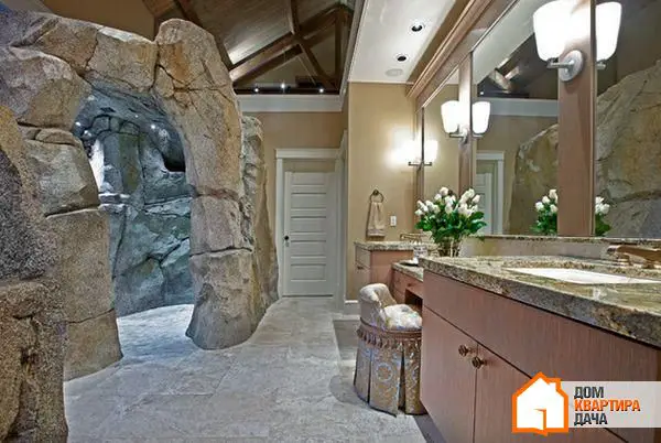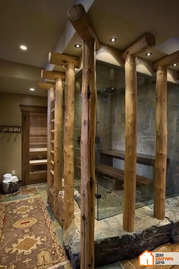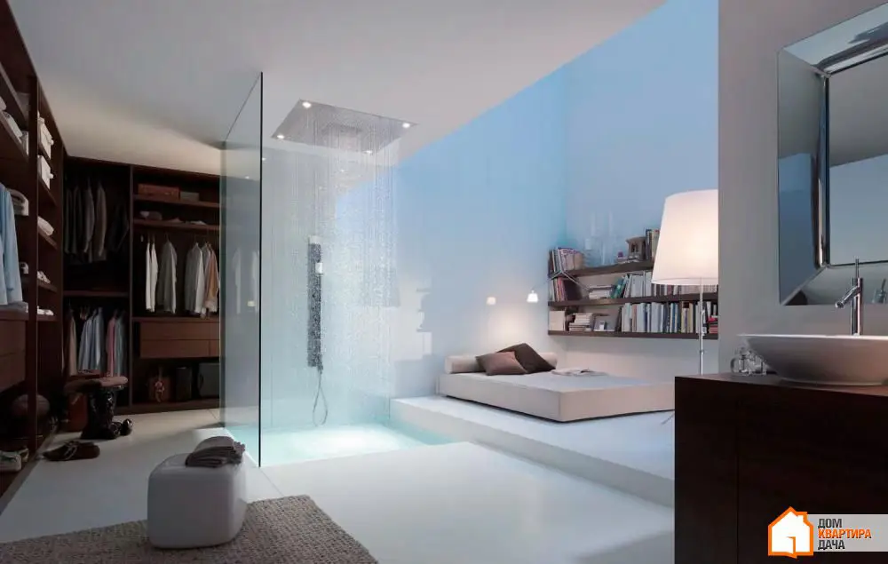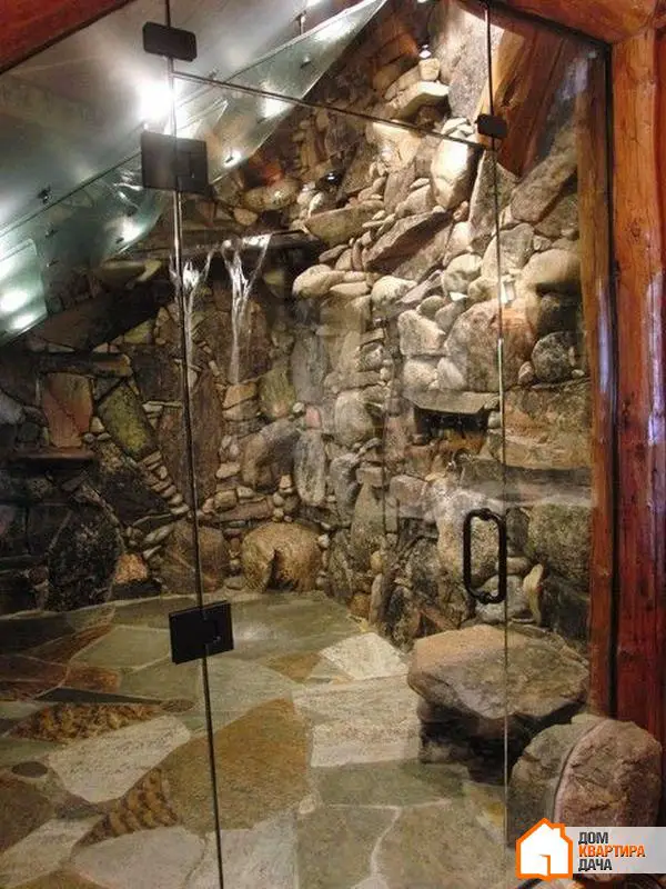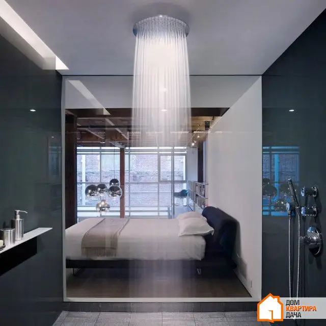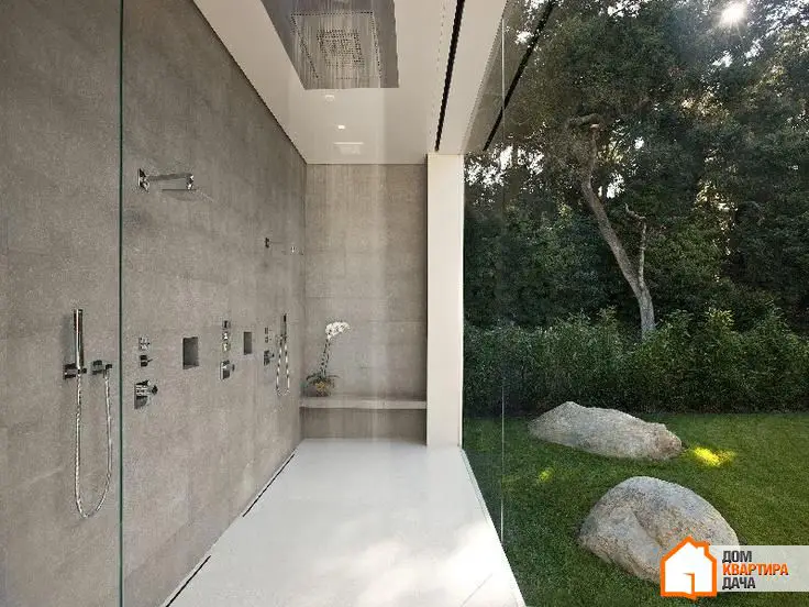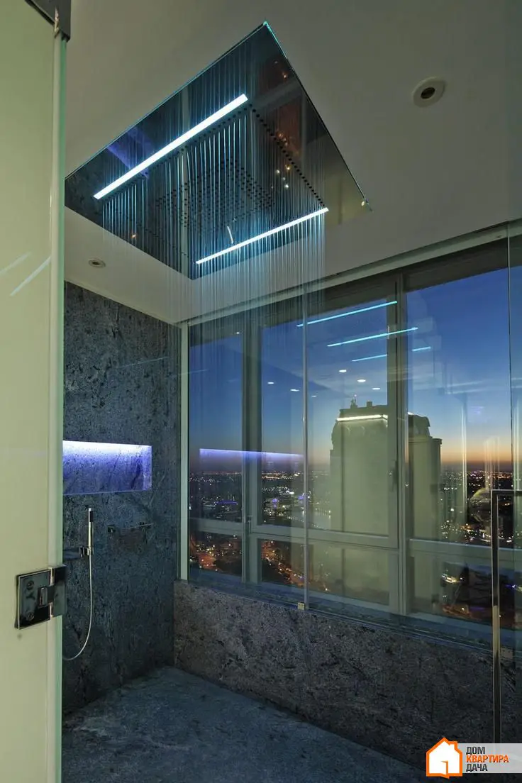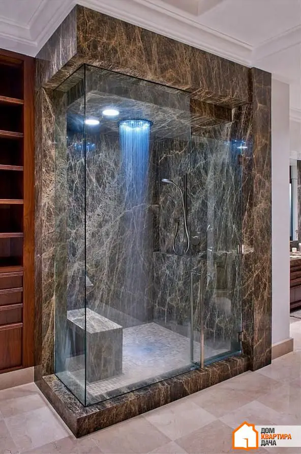 5. 这款紧凑型淋浴可能不是浴室的一部分,而是家庭中的一个独立元素,舒适地放置在开放空间中。天花板供水、花岗岩和玻璃墙面突出了设计师的现代品味。