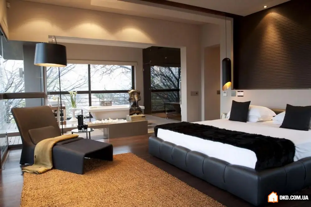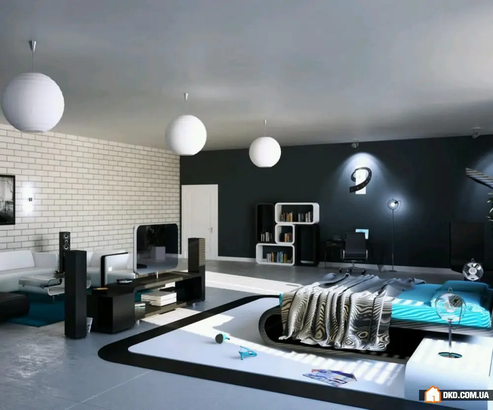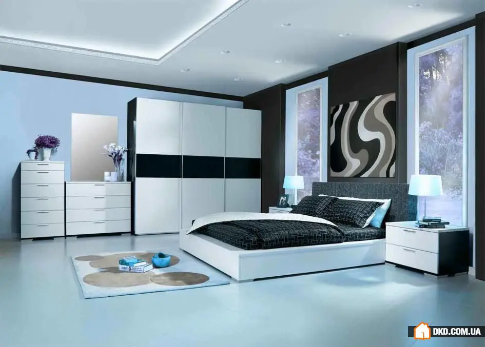 1. 黑白对比的现代卧室,搭配明亮的装饰灯光。