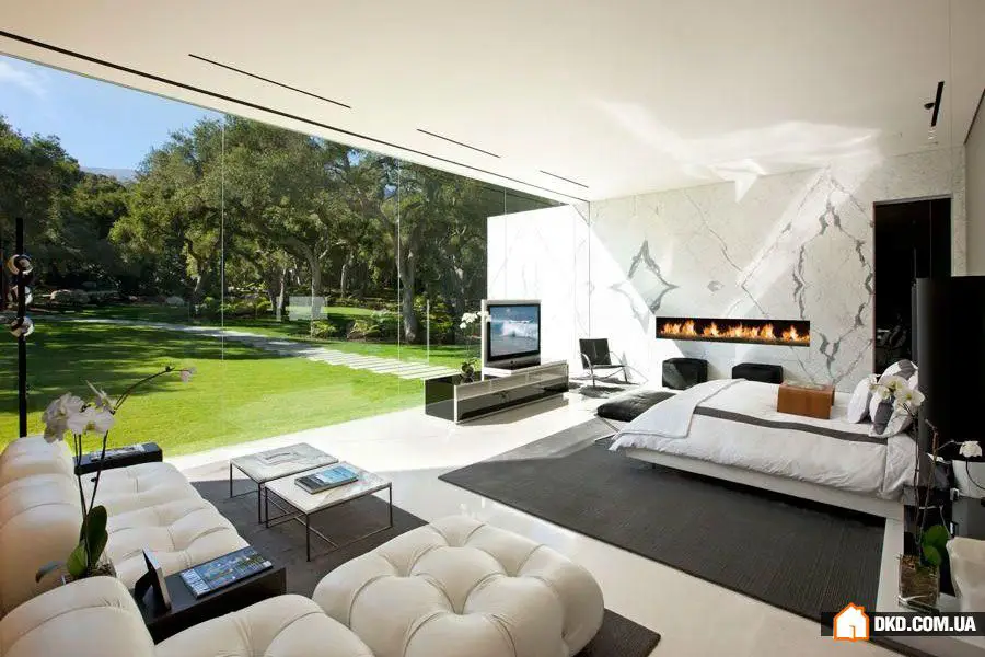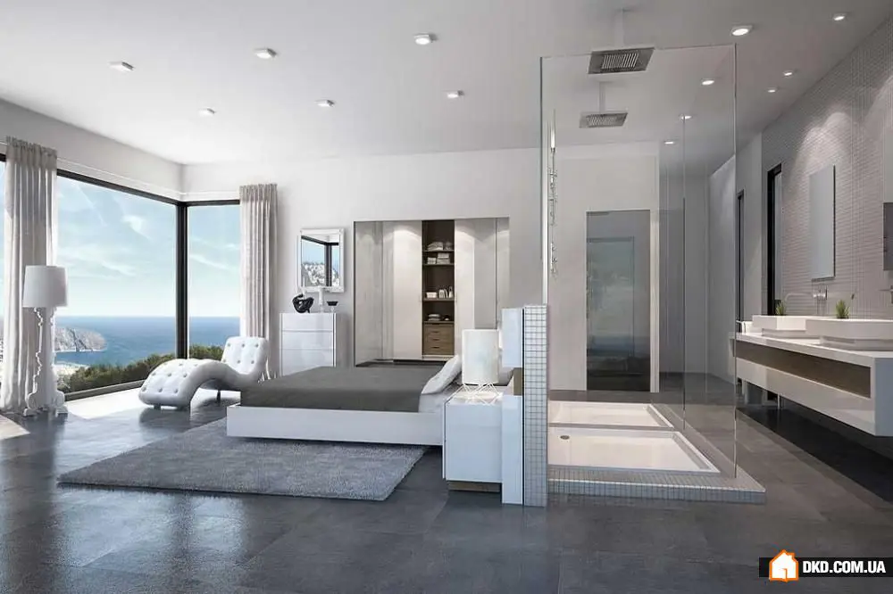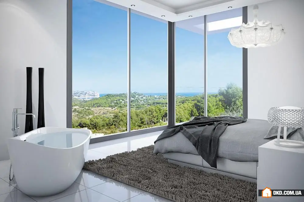 8. 开放式浴室和令人印象深刻的窗户景观的不寻常卧室。
