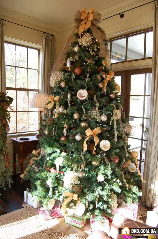 对称而时尚的圣诞树,带有柔软装饰和花朵