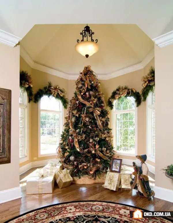 富丽堂皇的圣诞树,配有白色和金色丝带以及简单装饰