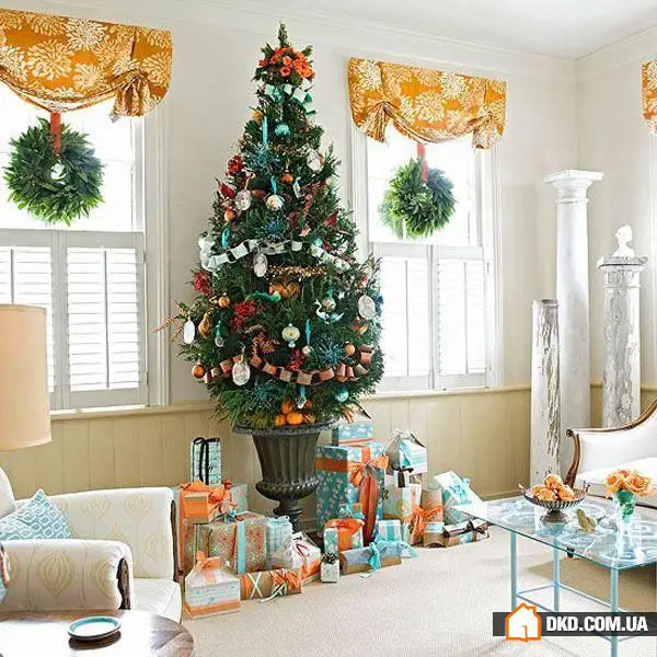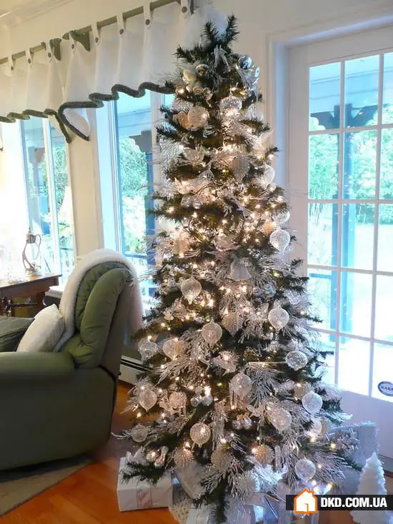 带有白色装饰和不寻常球体及礼品盒的树,底部颜色匹配