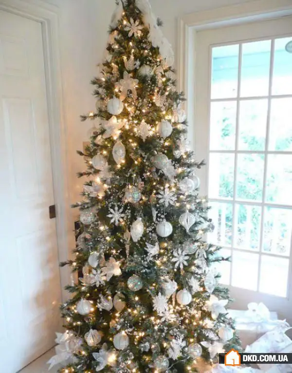 流行的圣诞树,配有白色装饰和微小的闪亮火焰