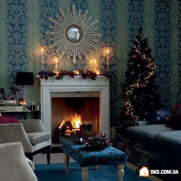 两个不寻常的小树,带有金色点缀,位于壁炉旁