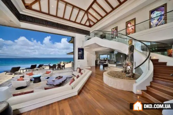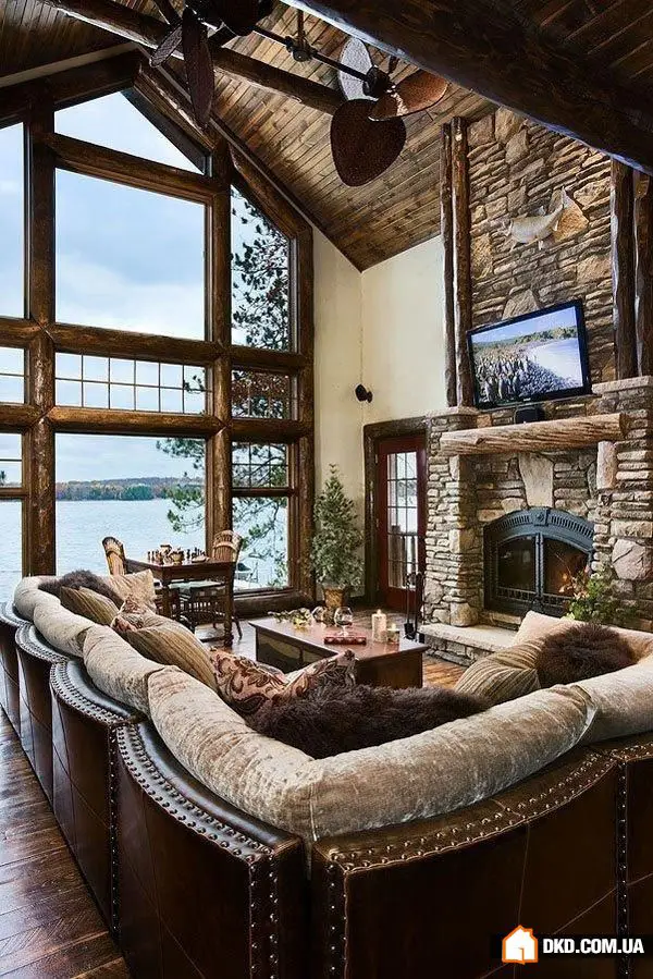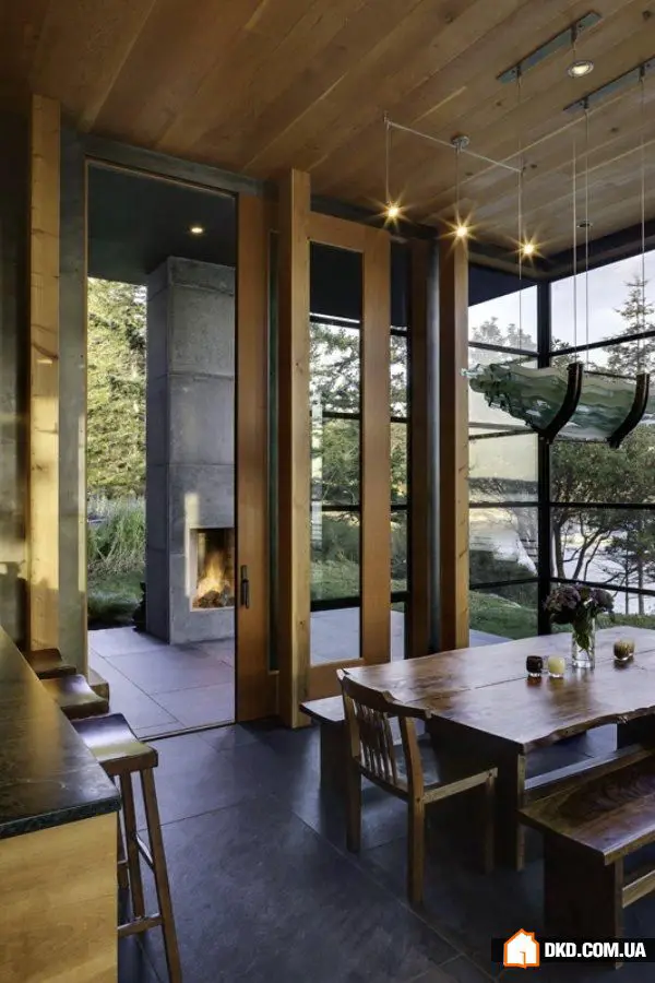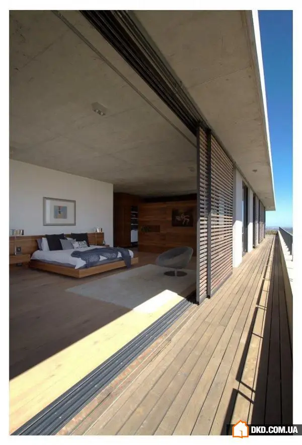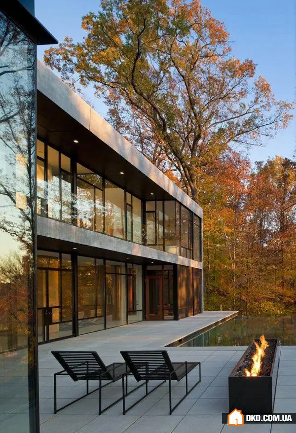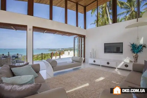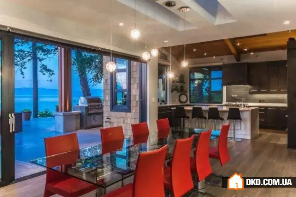 鲜艳红色椅子在极简室内与窗外难忘景色完美搭配。