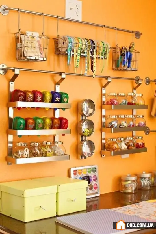 43. 使用轨道和篮子系统整理手工材料。通常由不锈钢制成,这些物品外观现代且多功能,也可储存毛线和丝带。