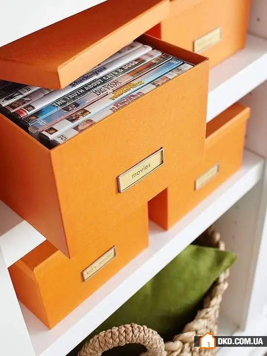 46. 将DVD和音乐光盘分类并装入吸引人的盒子中,颜色与您的家具相匹配。