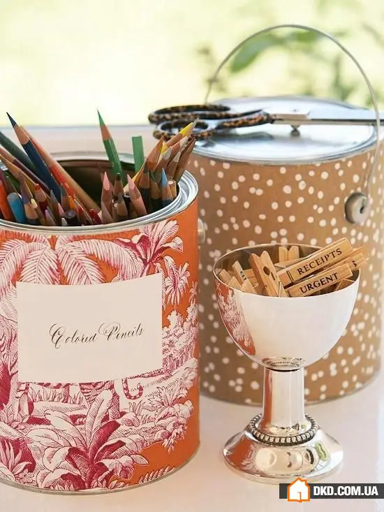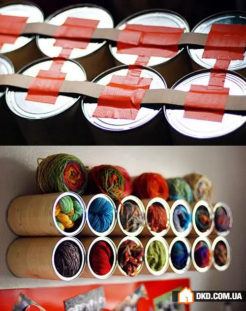 42. 将金属咖啡罐连接在一起并将其存放在毛线中。颜色和纹理将始终可见。将整个简单构造挂于墙上。