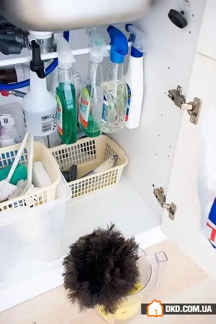 1. 在水槽下方使用架子或管道悬挂清洁用品瓶。