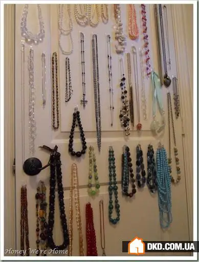 21. 使用回形针在衣柜内设置珠宝画廊。特殊的粘性钩子可防止美甲卡住。