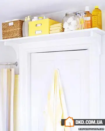 31. 浴室门上方的简单架子是存放不常用物品的好地方:清洁用品、额外毛巾、测量容器等。