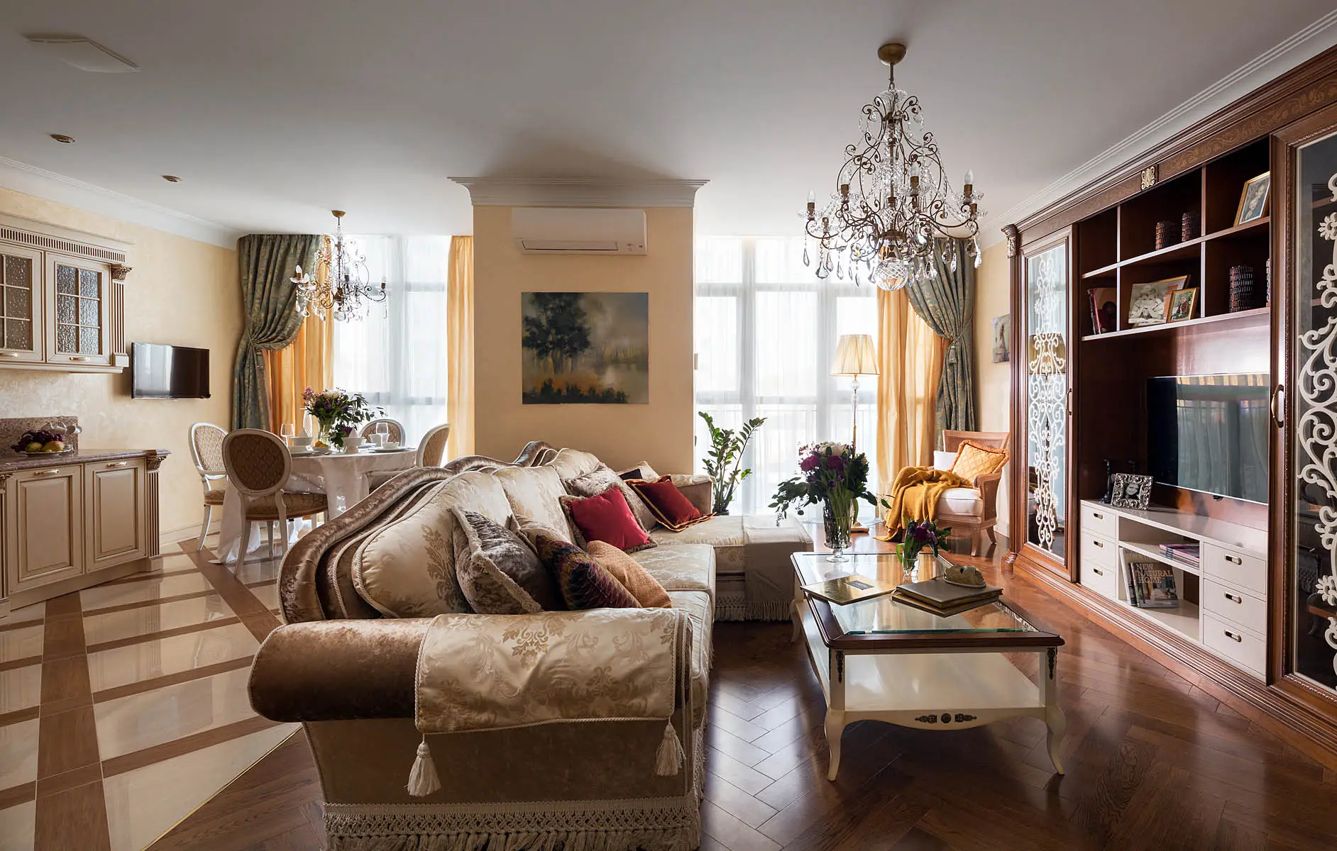 客户最初表示希望在公寓中采用现代风格,线条简洁清晰。现代风格的特点是没有复杂的造型和杂乱的家具或装饰。室内应留有充足的开放空间和光线。我们通过在室内使用浅色调和多样的照明场景实现这一效果。传统材料如木材、金属和玻璃也被用于现代风格设计中。