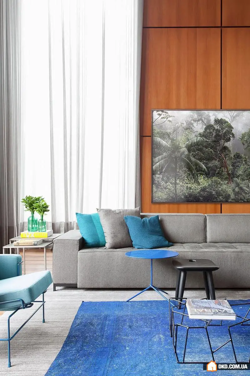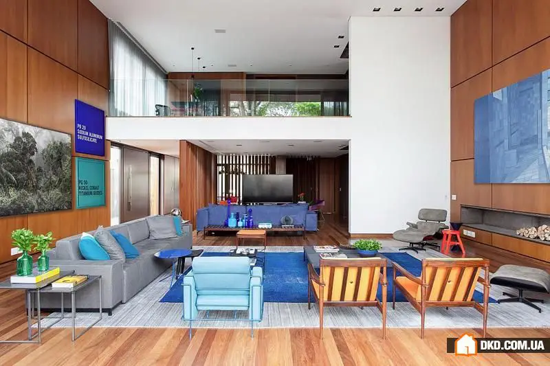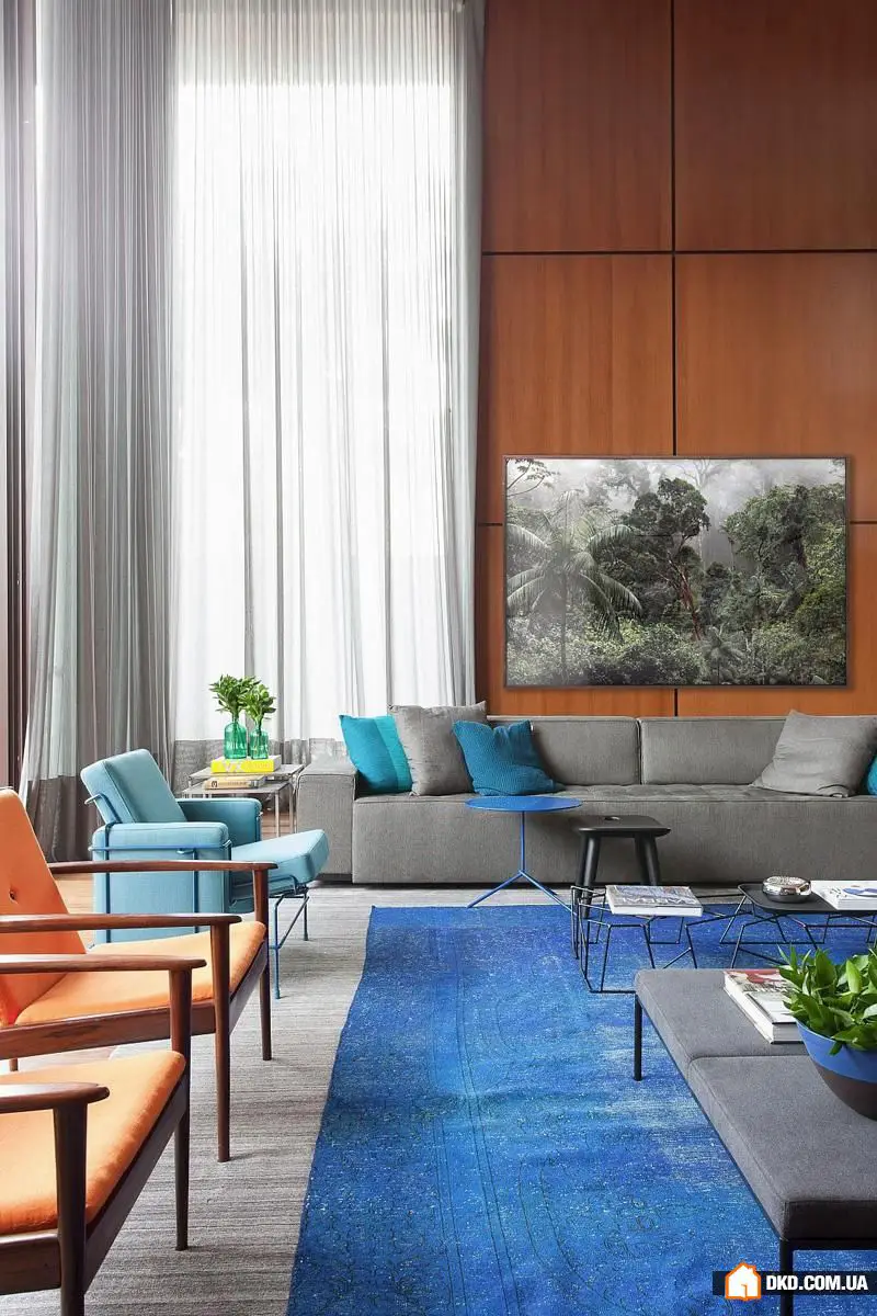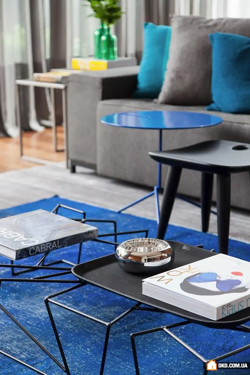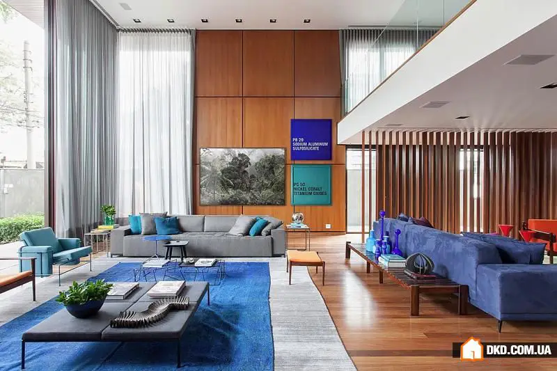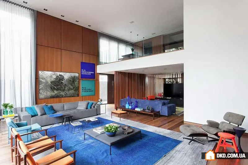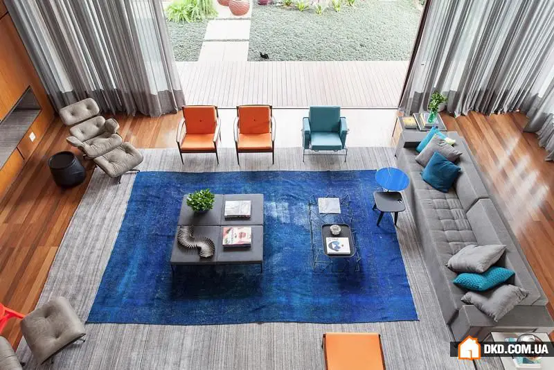 客厅是房屋中最重要的房间之一,拥有宽敞的开放空间,邀请您坐下放松。两张舒适的沙发配有装饰性靠垫,三把带有木质元素的复古椅子,以及一张宽敞舒适的扶手椅,可以轻松改变位置,使这个房间适合主人的任何用途,无论是儿童聚会还是商务会议。深蓝色地毯勾勒出空间的边缘和角落,映射出无形的天空。