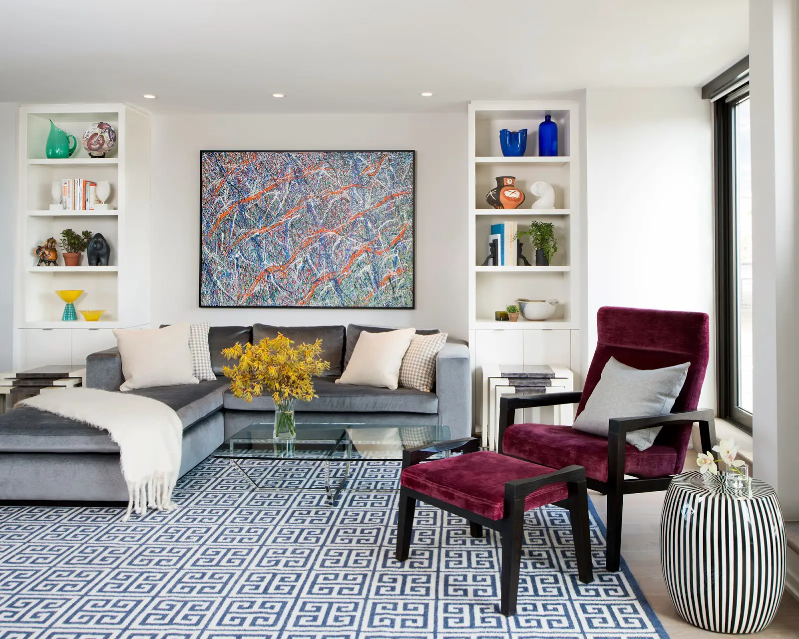 当一个人进入房间时,一幅美丽的、色彩鲜艳的艺术品、照片或海报立刻吸引注意力,房间的面积就显得次要了。一件艺术品可以为整个空间定调,通常不再需要额外装饰。