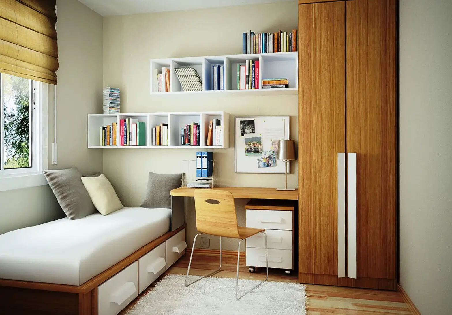 另一种欺骗眼睛的方法是选择与墙面颜色一致的家具。在这种情况下,橱柜在视觉上融入室内环境,不会使空间显得过于拥挤。