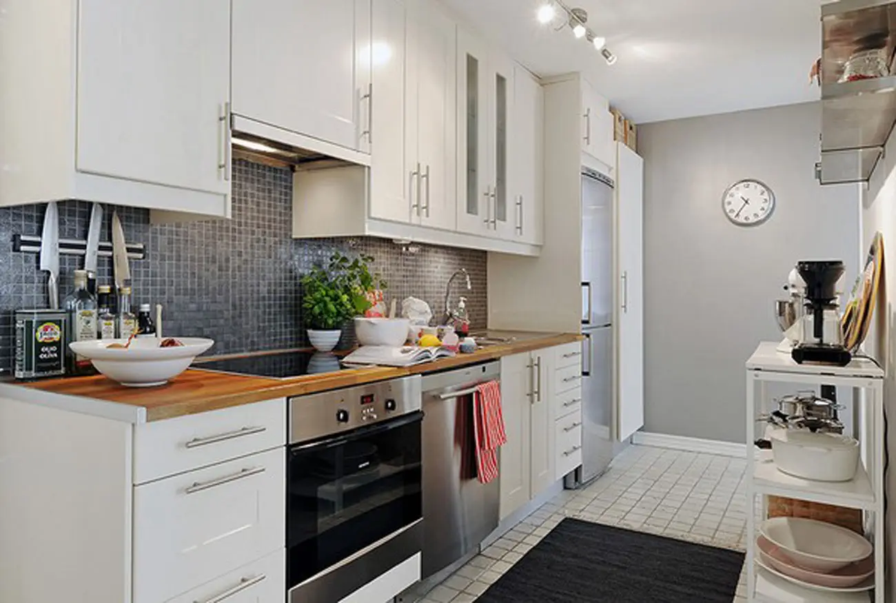 尽量将电器尽可能隐藏在橱柜中。内置抽油烟机、微波炉、洗碗机和洗衣机从视觉上帮助减轻小厨房的室内负荷。