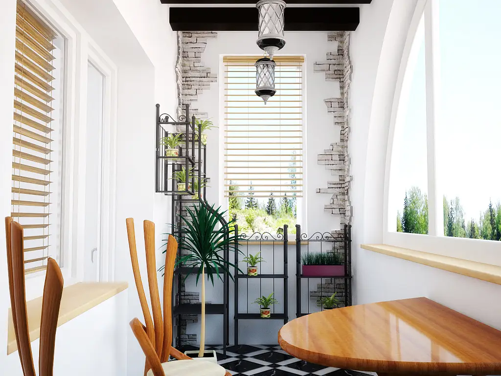 根据你的目标选择窗户装饰。罗马帘——“百叶窗”风格——非常紧凑,适合小阳台;百叶窗看起来现代、实用且易于使用,而卷帘则能有效遮光。