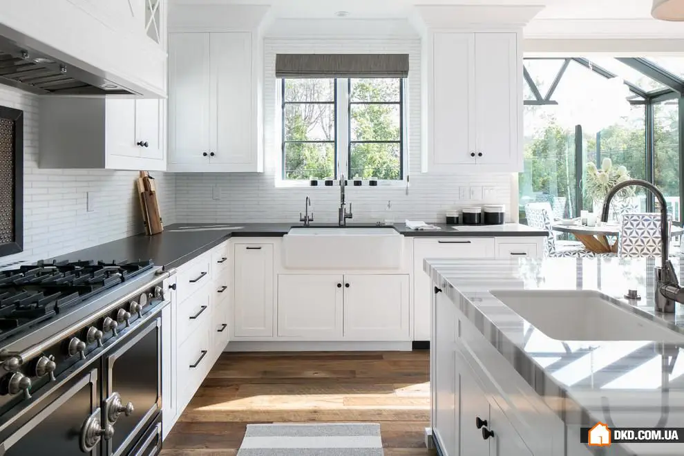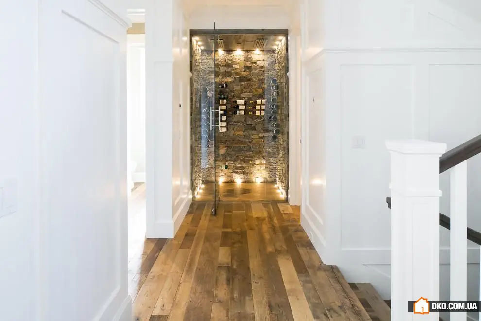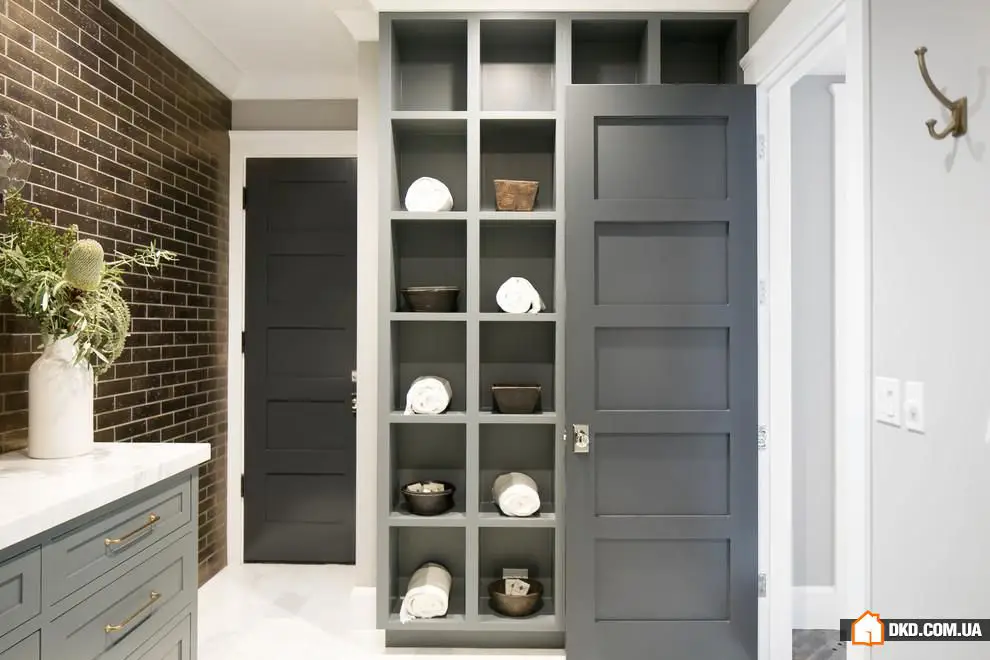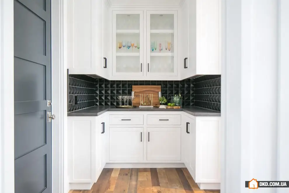 入口门厅配有黑色涂装的荷兰风格门和由修复农舍木地板制成的地板。这些元素与定制白色涂装家具形成对比。