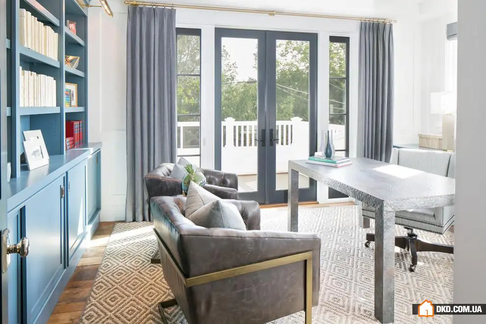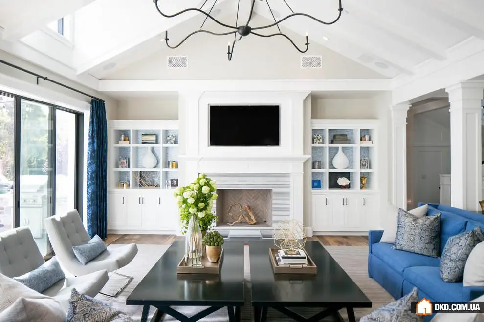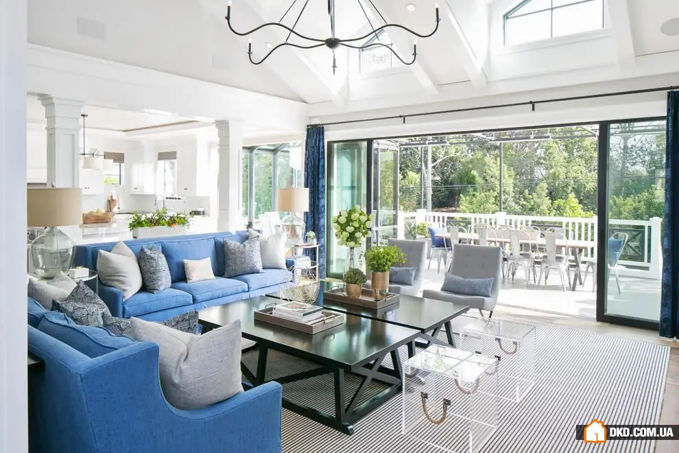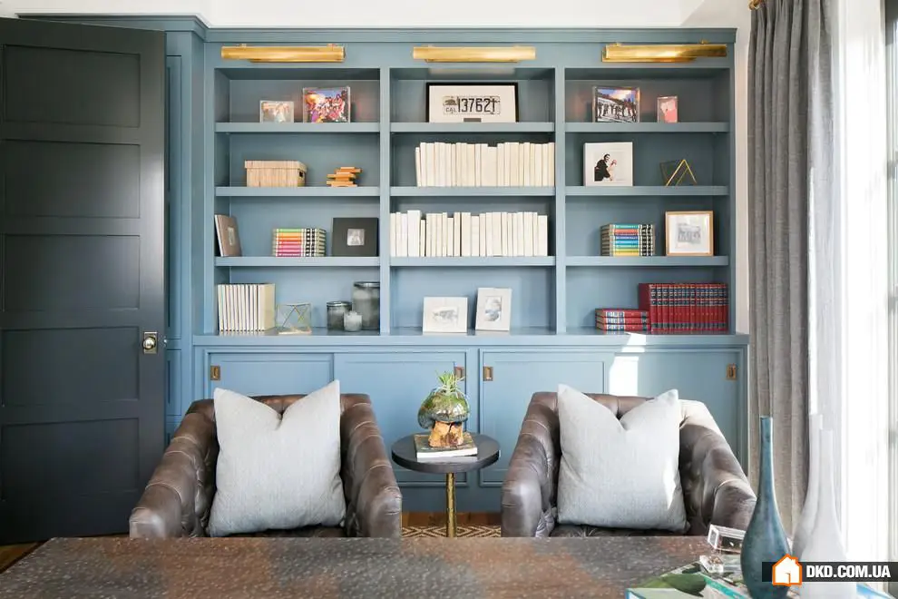 蓝色沙发:Casamance;灰色椅子:Lee Industries;地毯:Stark Carpet;吊灯:Cisco Home;窗帘:Zimmer + Rohde;书架壁纸:Designers Guild;咖啡桌:定制,Brooke Wagner