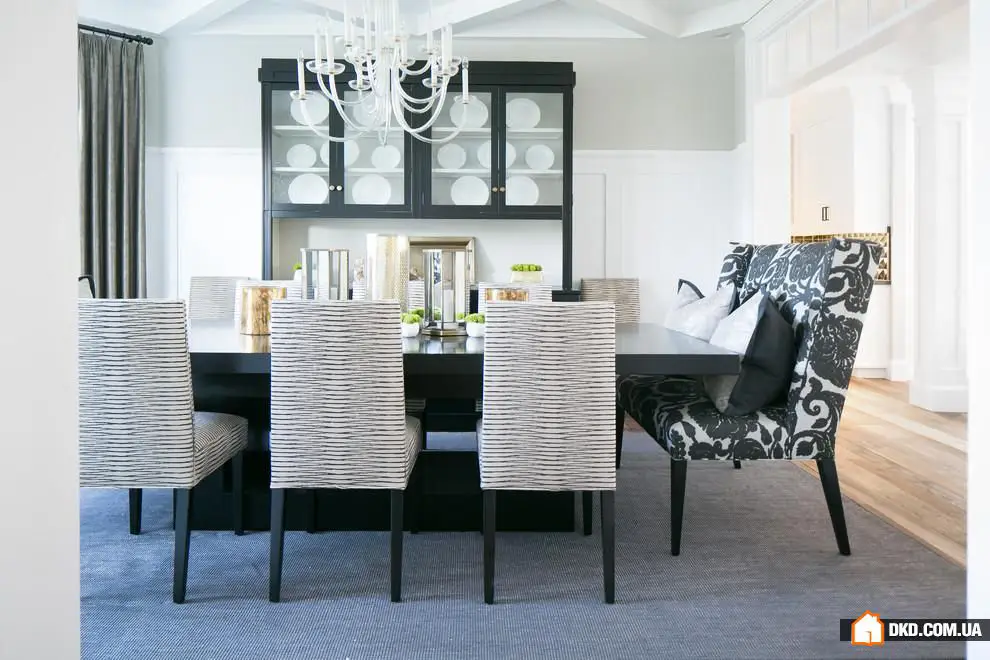 餐桌:定制,Brooke Wagner;椅子和沙发面料:Laura Lienhard Textiles;吊灯:Aerin;地毯:Rosemary Hallgarten;油漆:Shady, Dunn-Edwards