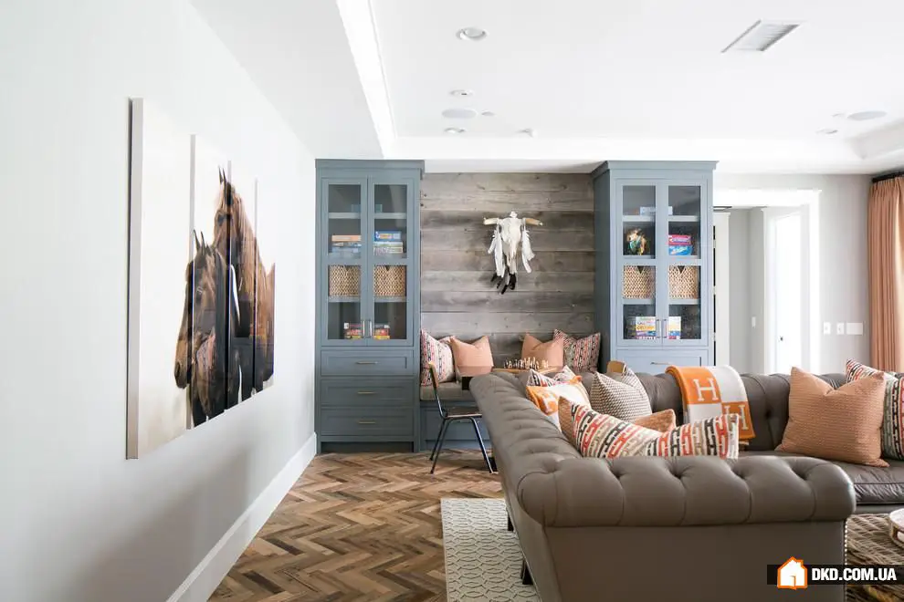皮质沙发:Barclay Butera Interiors;坐垫:Kneedler | Fauchère;地毯:Patterson Flynn Martin