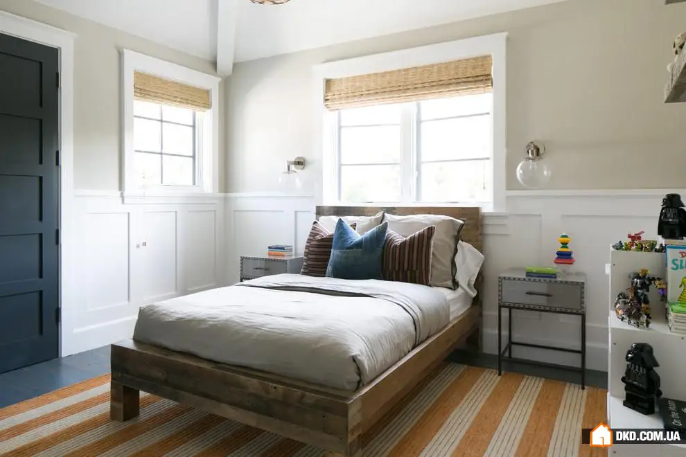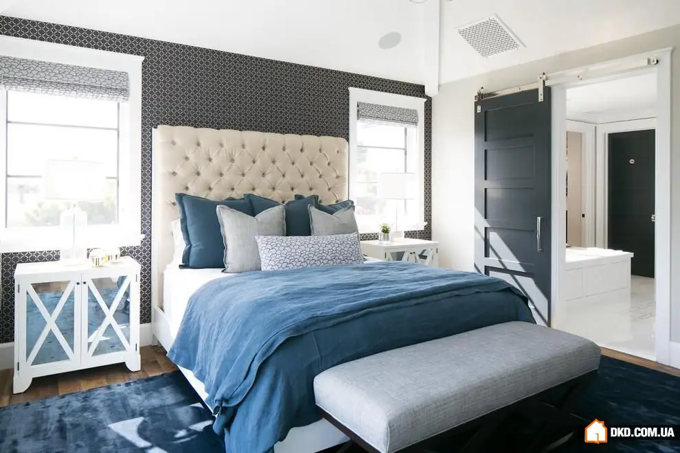 床和床头柜:West Elm;地毯:Barclay Butera Interiors