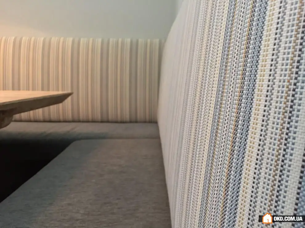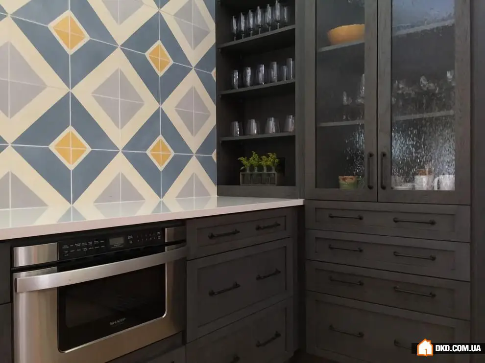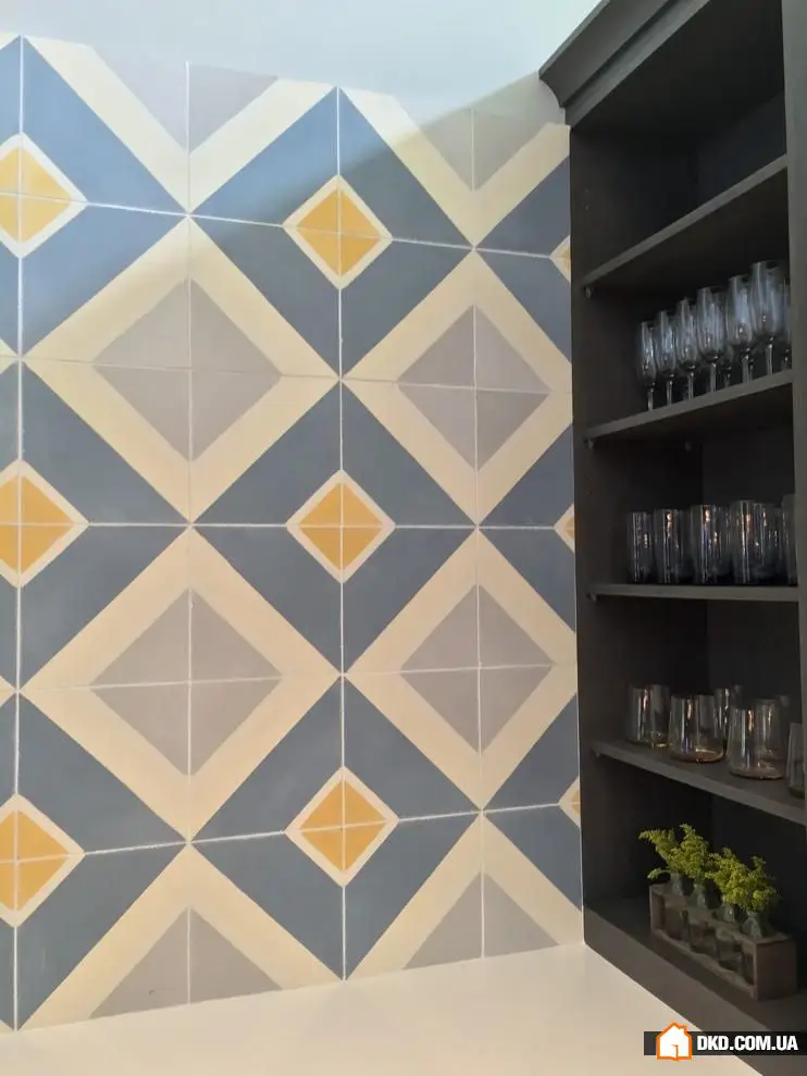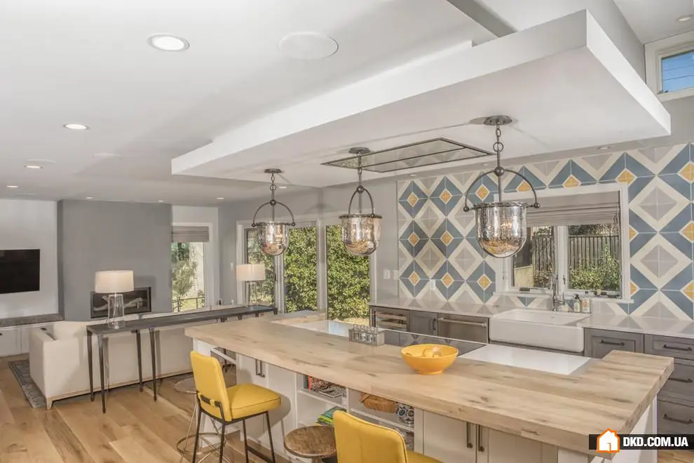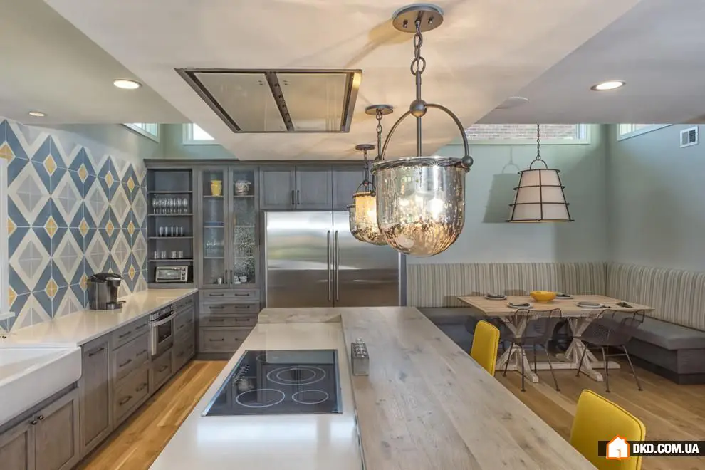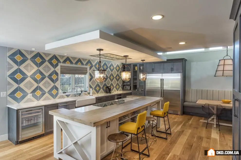 严格的几何图案和柔和的蓝色调在乡村风格的时尚厨房-客厅中创造出充满活力的点缀。